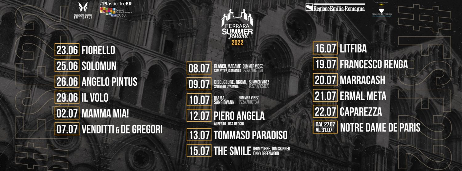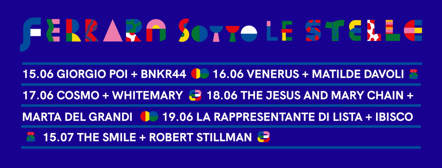15-19 Giugno e 15 Luglio Ferrara Sotto le Stelle 2022: è sicuramente il festival cittadino che ci ha formati, come ascoltatori, tanto che lo scorso anno ne abbiamo anche realizzato un documentario per raccontare i primi 25 anni della sua storia. Quest'anno compie un nuovo salto quantico: abbandonata del tutto piazza Castello, abbandonato il parco Massari, ci si sposta in una area recentemente rinnovata della città, la nuova Darsena. Programma molto legato all'Italia indipendente (ma con ambizioni mainstream), un ritorno dopo un solo un anno e due grossi nomi internazionali. Gli storici The Jesus And Mary Chain e i The Smile, ospiti in piazza sul Listone, con il ritorno di Thom Yorke, frontman dei Radiohead, in un disco estemporaneo che suona molto come i Radiohead stessi (c'è ovviamente Jonny Greenwood e Tom Skinner, dei Son Of Kemet, a spostare la batteria su territori più jazz). Se dovete sceglierne uno solo, scegliete questo. -- Leggi il racconto del concerto di Venerus -- -- Leggi il racconto del concerto di Cosmo -- -- Leggi il racconto del concerto de La Rappresentante di lista -- //Aggiornamento: la data del 15.06 con Giorgio Poi è stata rinviata e verrà recuperata il 29/7 durante il Festival Carino // (19/06)