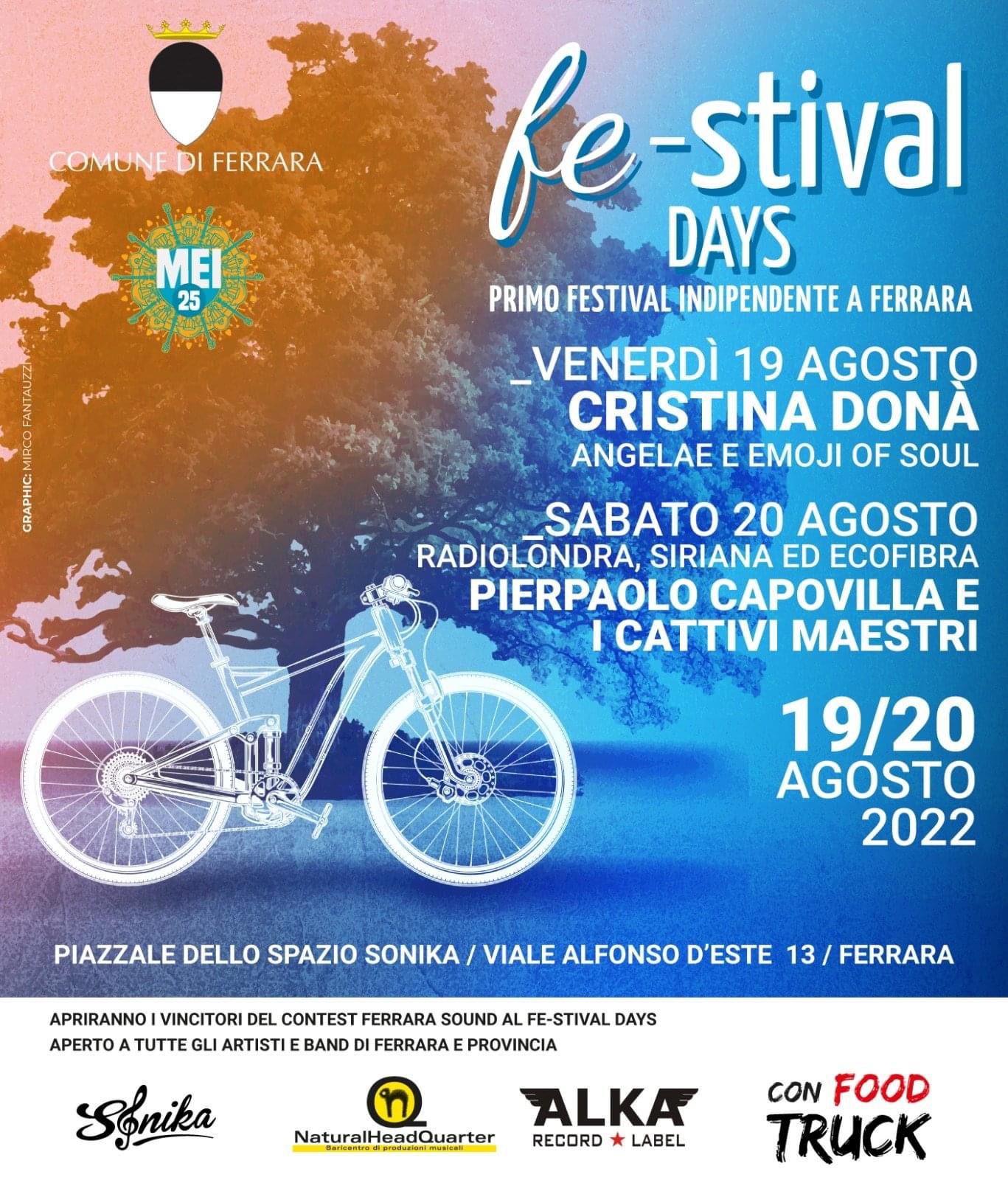 Il 19 e 20 agosto ci sarà la prima edizione di FE-STIVAL DAYS, al Parco Sonika, con Cristina Donà e Pierpaolo Capovilla (ricordate Il Teatro degli orrori?) appena uscito con un album solista. L'evento è organizzato da MEI-Meeting delle Etichette Indipendenti, in collaborazione con Natural Head Quarter Studio, con le due etichette ferraresi Alka Record Label e (R)esisto Distribuzione. Includerà inoltre un concorso per band emergenti aperto a tutti i generi e i gruppi della provincia di Ferrara.