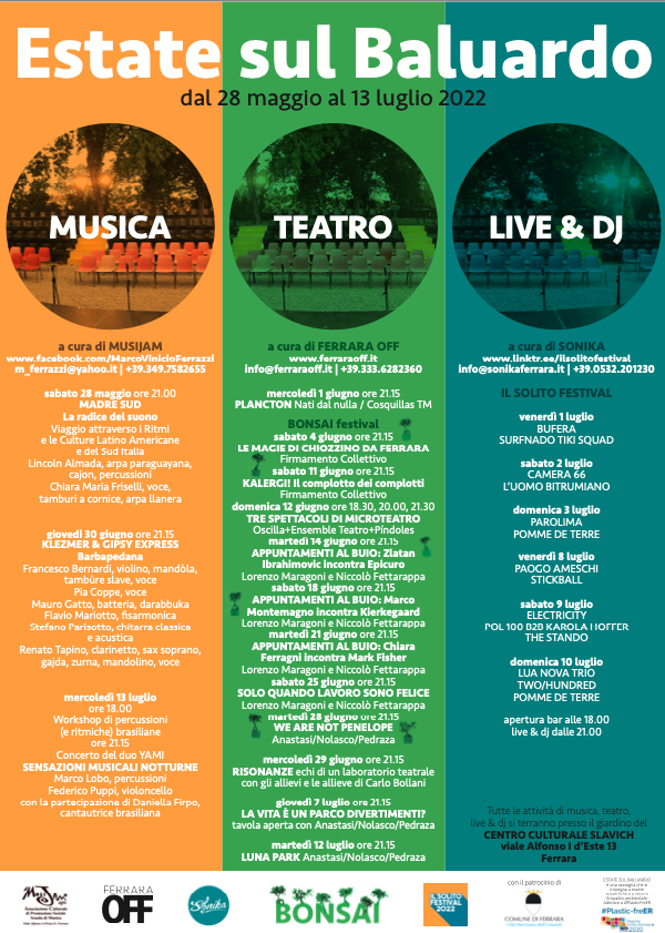 Dal 28 Maggio al 13 Luglio spazio a musica e eventi a "Estate sul Baluardo", con due programmazioni, una ad opera di Musicjam e a luglio due weekend con il ritorno de "Il solito festival", organizzato da Sonika e Korova Milk Bar, che punta come al solito ad una programmazione indipendente e piena di ricerca. Programmazione con doppio live ogni sera in generale, tutti gli eventi saranno al Centro Culturale Slavich, in viale Alfonso I d'Este 13.