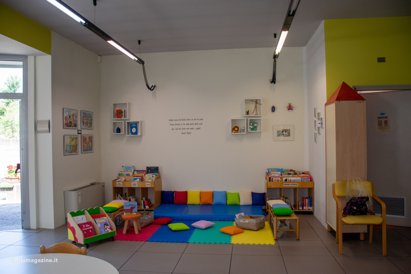 Passeggiandoci si notano le enormi possibilità che consente questo tipo di edificio: dalla sala con quotidiani e riviste (l’emeroteca) al giardino interno, dagli spazi espositivi alla sala multimediale e quella ragazzi, fino al giardino esterno, il tutto in una progettazione accessibile a chiunque, anche a chi avesse difficoltà di movimento, perché pensata su un unico piano.