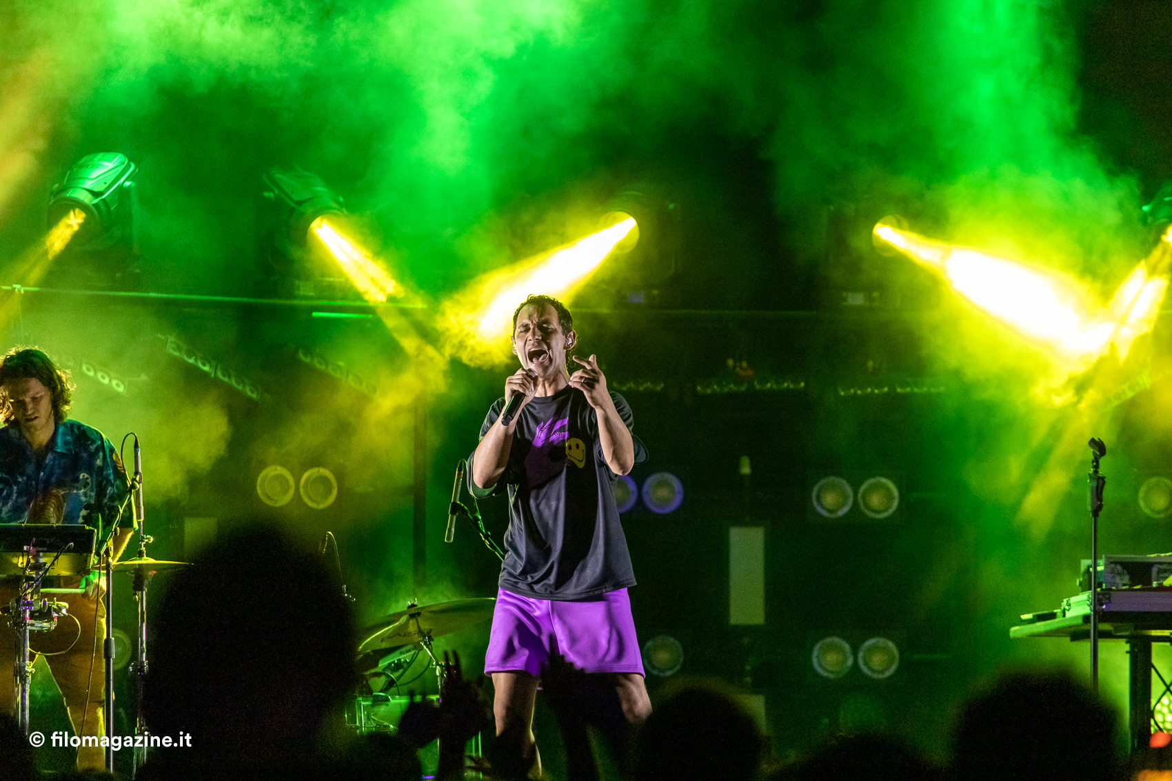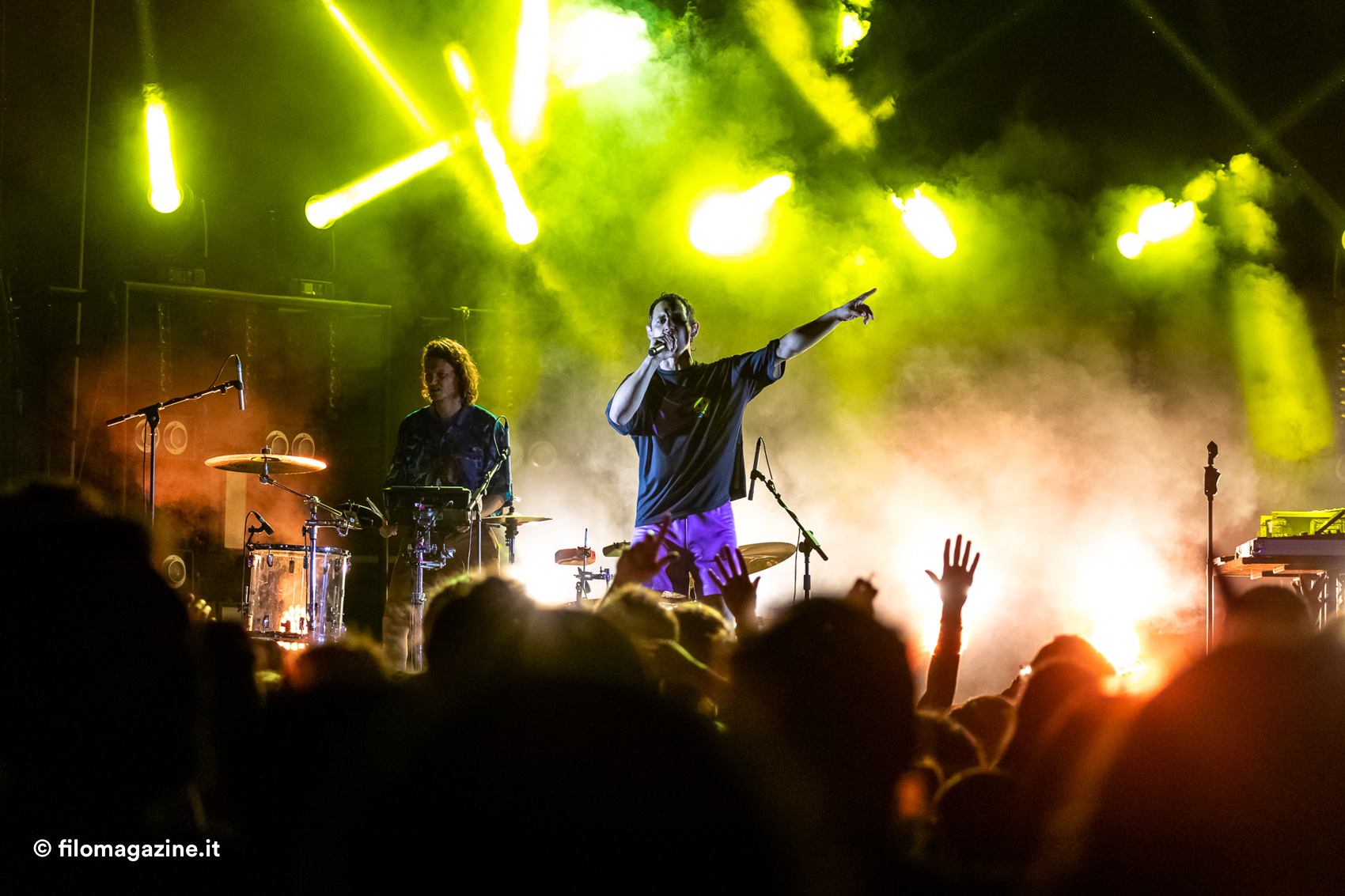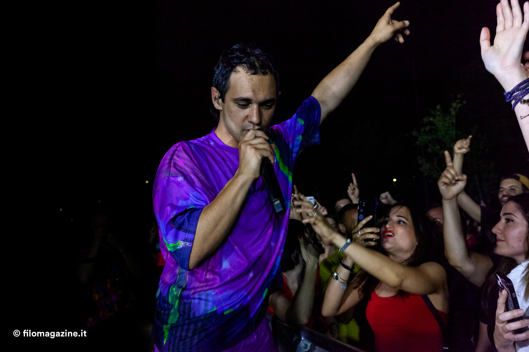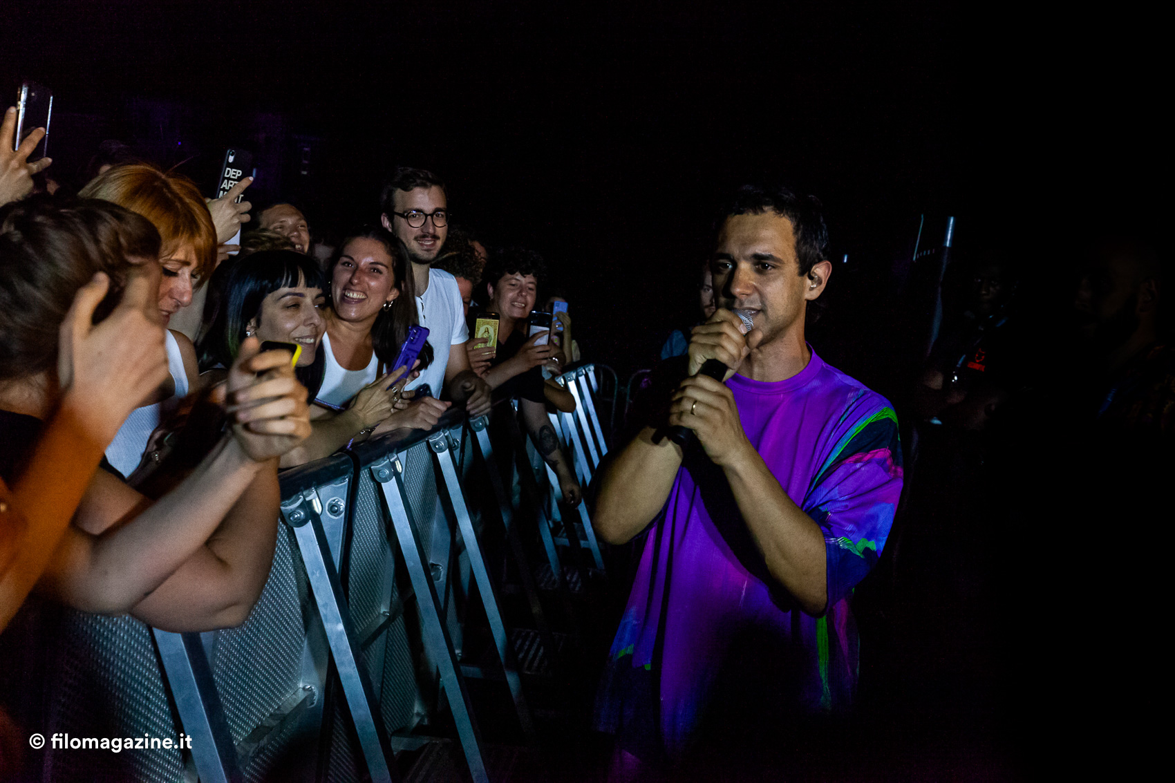 Dove, pur senza enormi sussulti emotivi, può capitare di vedere volare verso il pubblico cartoni di pizza che si aprono (sarà per via del verso di uno dei suoi pezzi: festival, polizia, pizzeria) , di osservare la scomparsa di magliette e canottiere dal palco che lasciano spazio alla pelle nuda, di leggere sulle labbra del pubblico rapito inni essenziali quanto riusciti (la verità è che ci piace stare bene / la verità è che ci piace stare insieme / così). Soprattutto, muovendosi a lato, dentro, a fianco, lontano dal pubblico, appare chiara la connessione centrale tra artista e pubblico verso un preciso scopo: la voglia di celebrare la gioia.