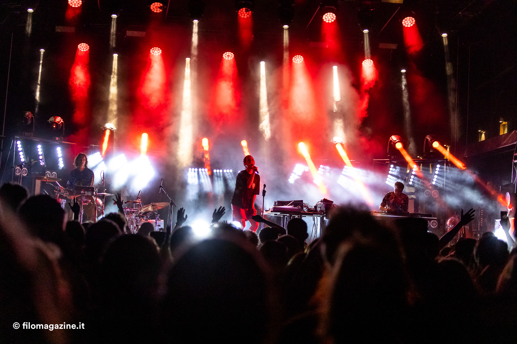 Un paio di minuti dopo le ventidue inizia la festa, in una area sotto il palco sufficientemente piena di anime arrivate con il desiderio di ballare. Ecco, questo è l’argomento centrale del live e il centro del discorso: quello di Cosmo è un concerto che nasce per essere cantato, per la mano al cielo, per le gambe ad attendere il momento in cui esplode la cassa dritta e tutto diventa una gioiosa festa elettronica.