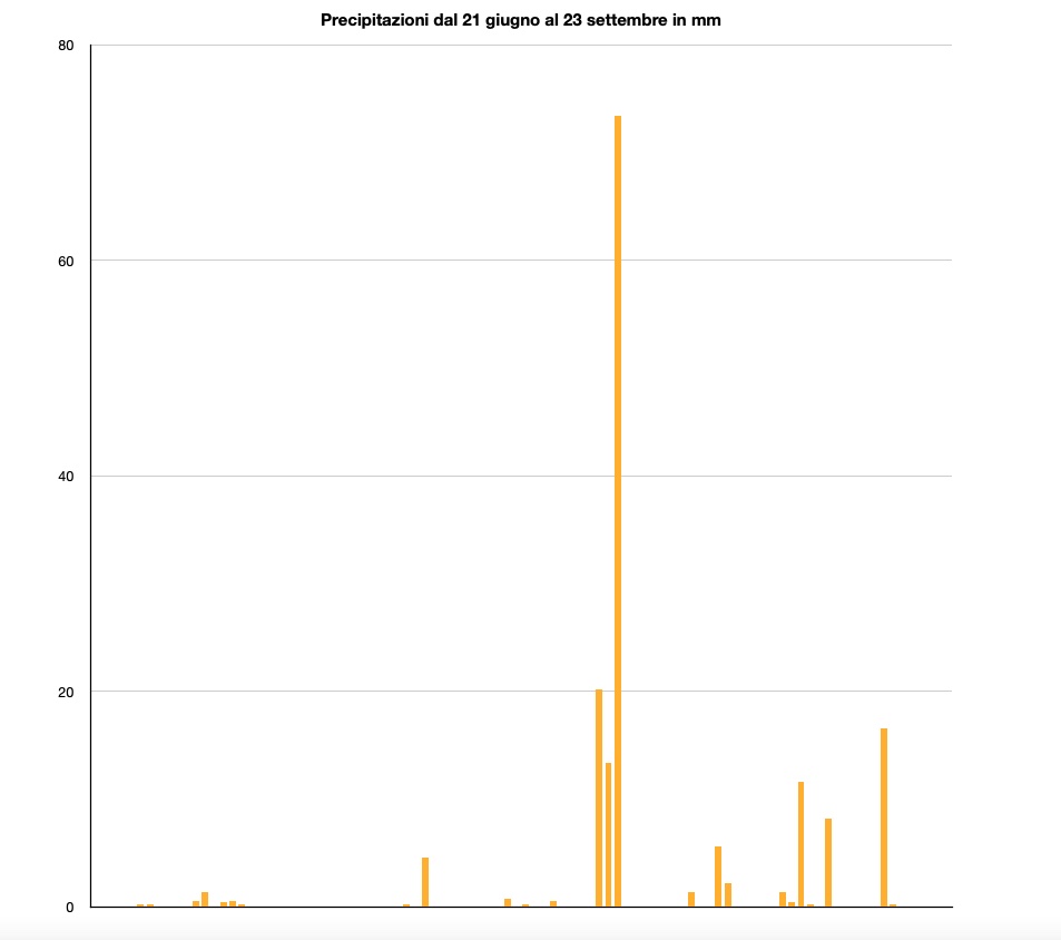 I dati ci raccontano che su 94 giorni di stagione estiva, in 70 giorni non ha piovuto. Ma se andiamo nel particolare, solo in 12 giorni (su 94) è piovuto almeno un millimetro d’acqua nelle 24 ore e nella pratica tutte le piogge sommate non raggiungono la quantità d’acqua piovuta nella giornata del 19 agosto, nel giro di pochissime ore.