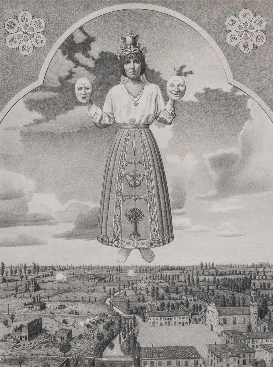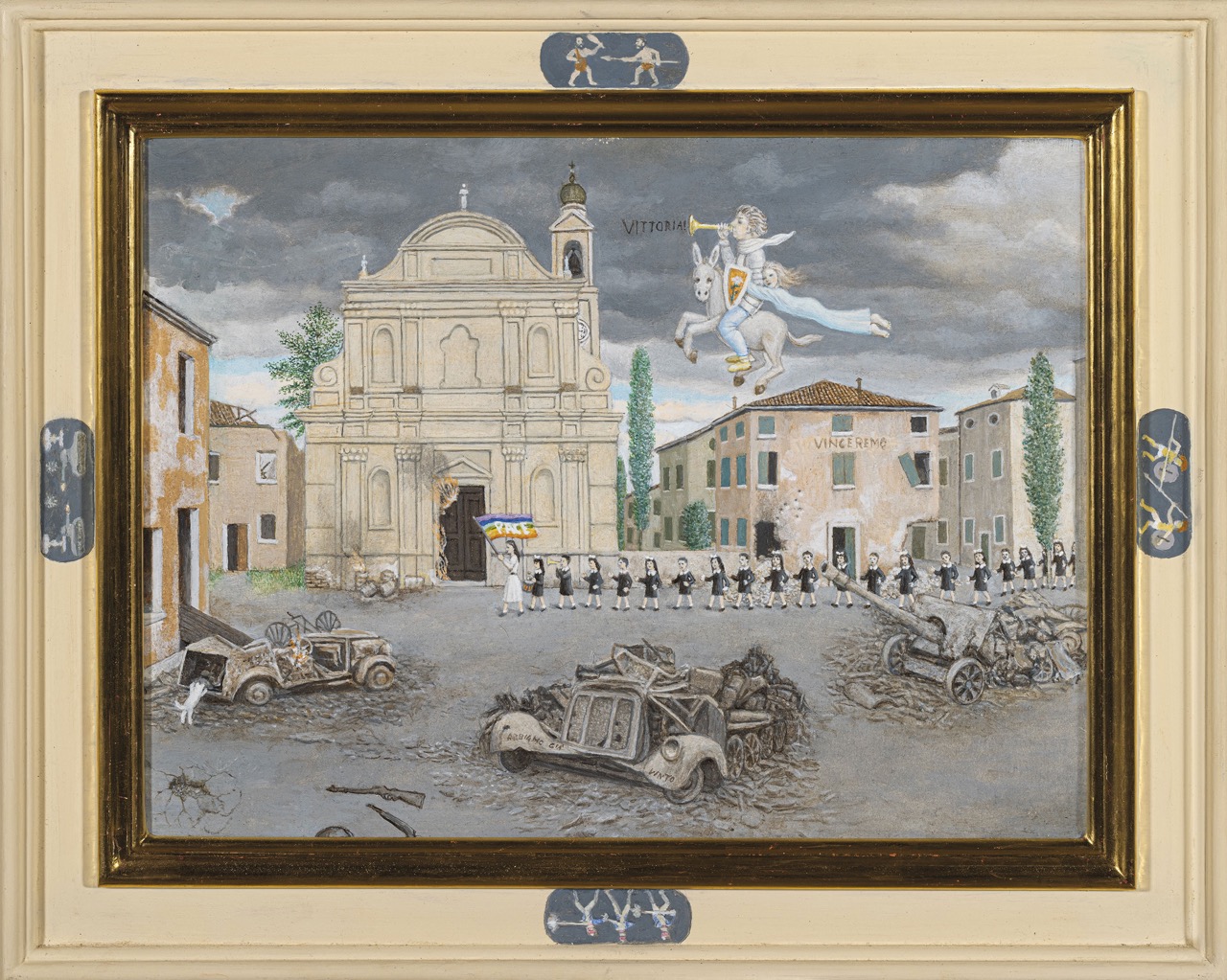 Ne Il rientro della notte, 1986, anche se destabilizzati dai colori dell’alba, ci si sente subito a casa. Come lo è La fine della guerra infinita, del 2021, dove ci si avvicina sempre più alle origini del pittore, ai suoi primi ricordi, con la piazza di Ro Ferrarese ben riconoscibile. Aguzzando lo sguardo, avvicinandosi al quadro, il suo paese natio c’è anche nel disegno Il destino, del 1985.