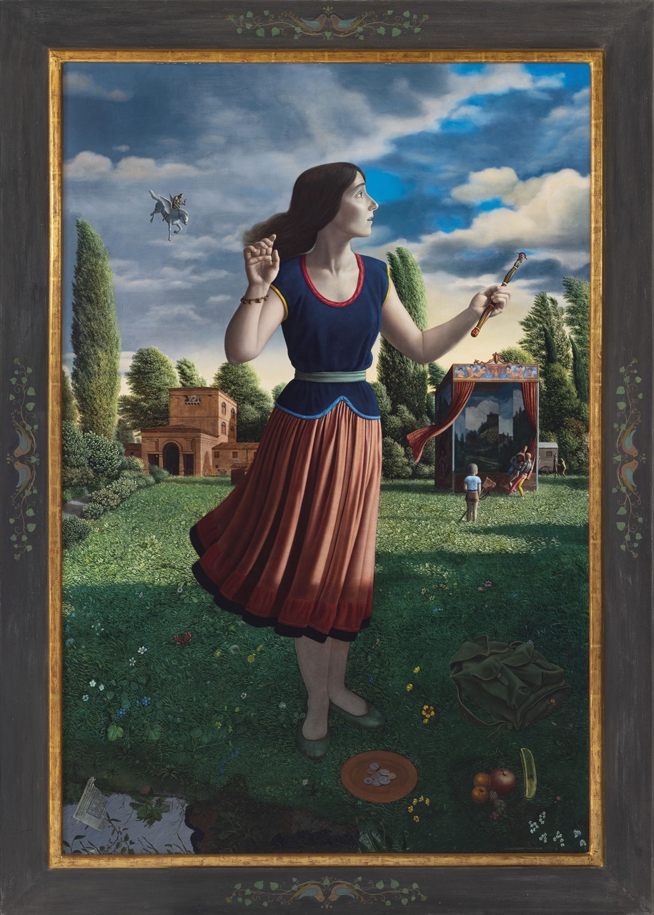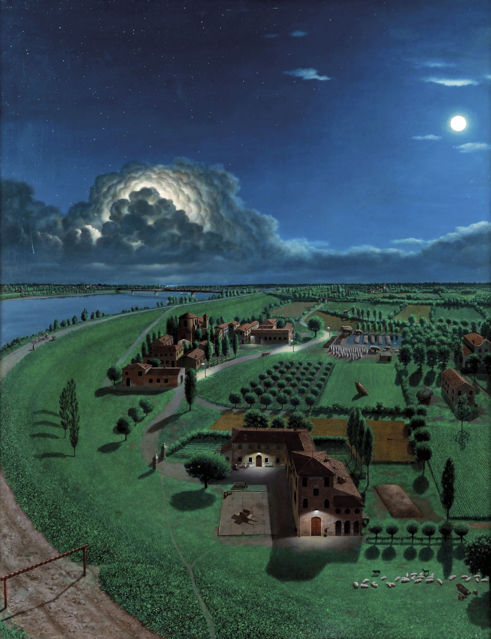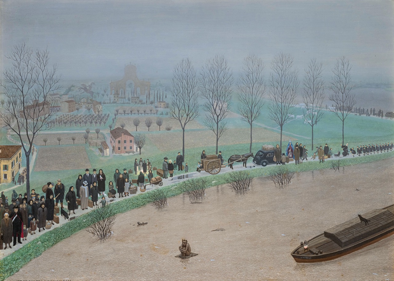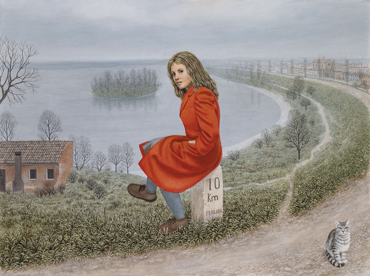 Infine c’è il dipinto simbolo della mostra, Il paletot rosso (2006), in cui il grande fiume e i suoi argini raccolgono la giovane donna il cui cappottino dal colore acceso si staglia sui colori tipici delle nostre terre. Ci fissa, come a chiederci: “Vi aspetto da una vita, quando venite a prendermi?”. È il Po sopra Berlino, è la storia di un ragazzino che aspetta che qualcuno lo riporti finalmente a casa.