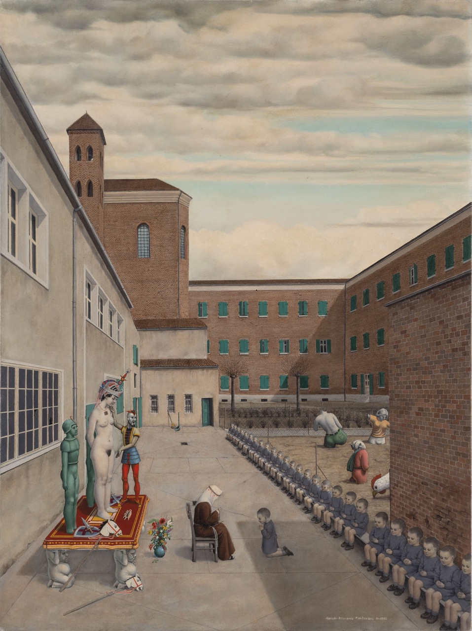 Per esempio nel suo dipinto Il rosario 1, del 1976, presente in mostra, si intravedono l’abside e il cortile del convento di Sant’Apollonia in via XX settembre – ricreati a memoria – dove c’era il Grisoli, primo collegio dove Mantovani trascorse la sua infanzia.