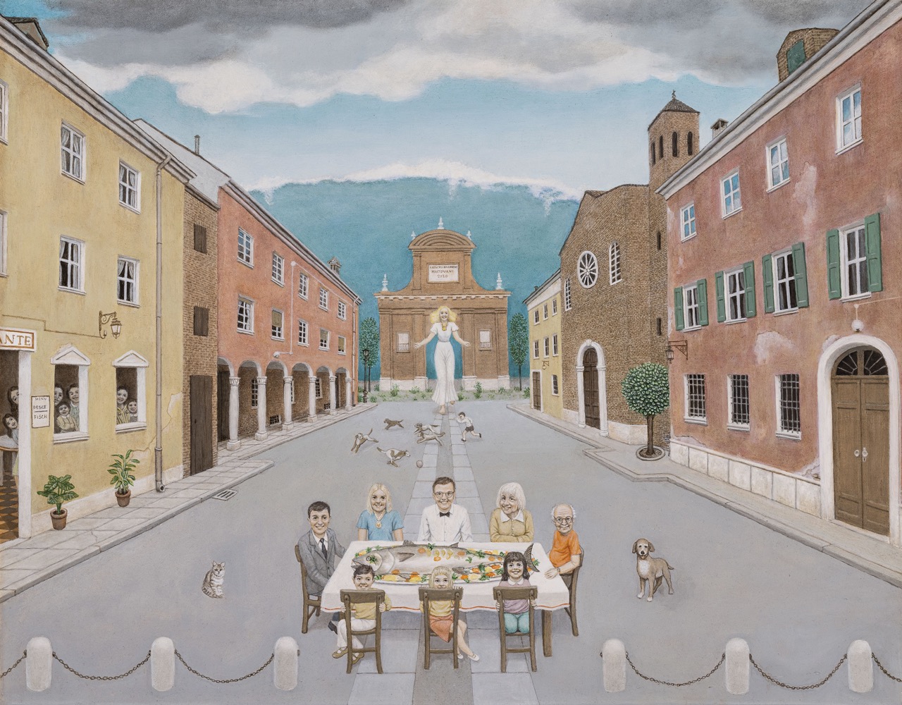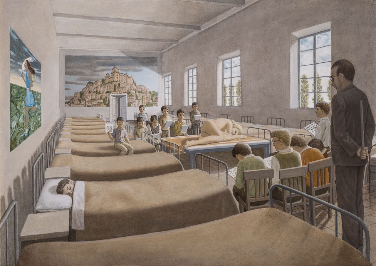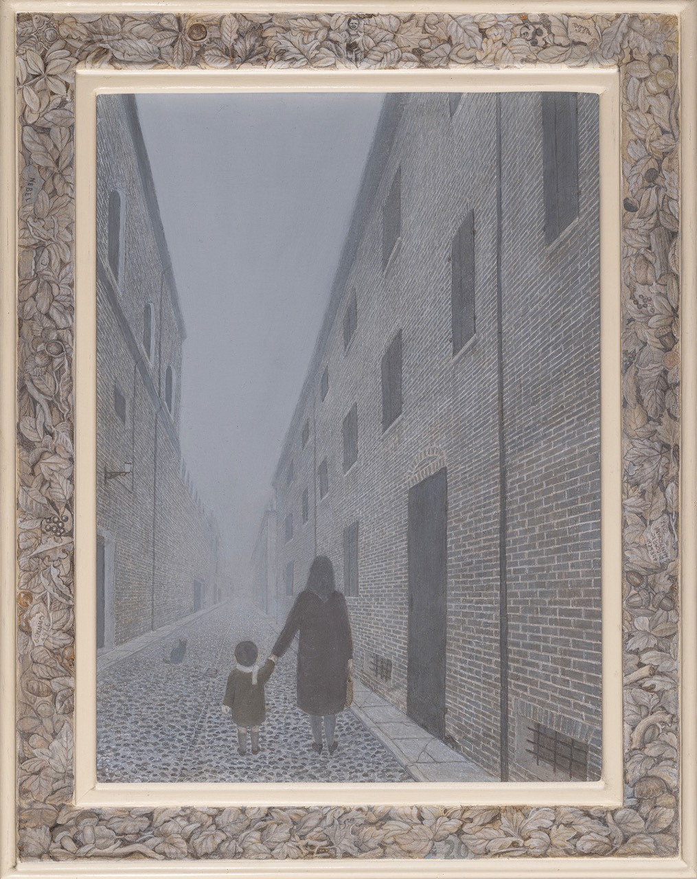 In fondo allo stanzone di Prima del risveglio (2016), che riunisce i bambini ‘senza famiglia’ del collegio, in una sorta di trompe l’oeil ecco spiccare il Castello Estense, mentre ne La grande onda, del 2020, è rievocata la lunga prospettiva di via XX Settembre.