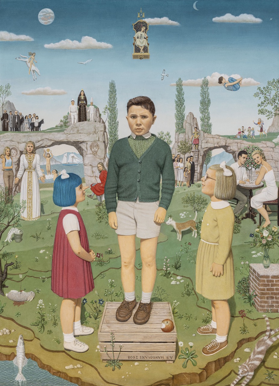 Con Adelchi Riccardo Mantovani ci troviamo spesso di fronte a paesaggi al limite del surreale. In Paesaggio eroico, del 2008, dove l’artista fa incontrare un po’ tutti i suoi personaggi presenti in opere precedenti, gli elementi rocciosi rimandano al mondo agrario e fantastico del ciclo di Schifanoia.