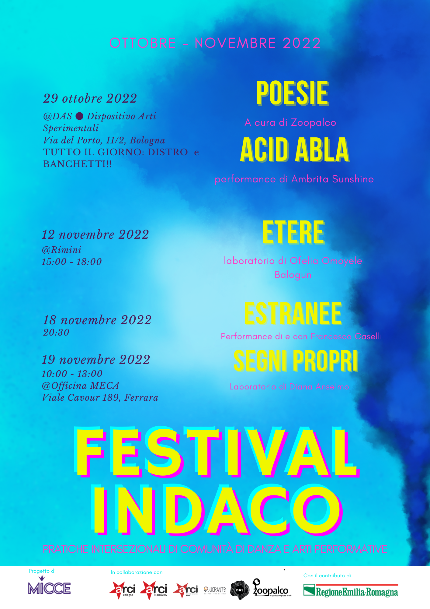 Il Festival Indaco, Pratiche intersezionali di comunità, danza e arte performativa è un progetto ideato da MICCE e dal Fattoria Indaco, compagnia di danza che ha l’obiettivo di promuovere e ad coltivare il talento di performer che provengono da diversi contesti, anche svantaggiati.