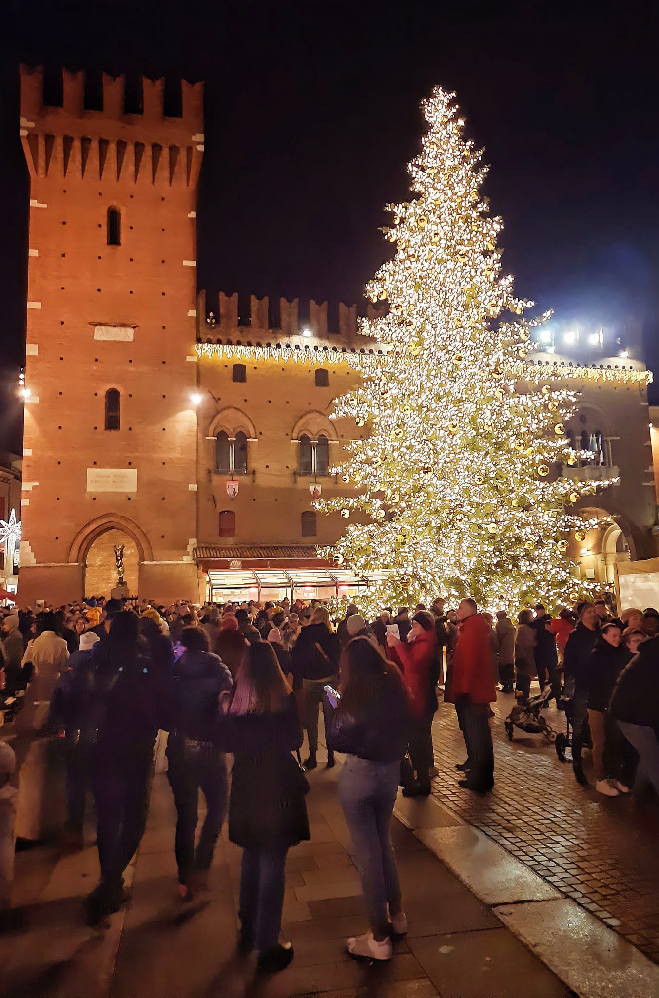 Ormai è tutto acceso, compreso l’alberone centrale che, come sapete, fedeli lettori, ci appassiona. Per questo 2022 abbiamo a che fare con un abete di specie Discolo. Forse ricorderete il temerario abete 2013 – ne parlavamo qui – che si era tutto bello impigliato nei fili della luce? Ecco, stessa natura pericolosamente ribelle, i 14 metri dell’albero 2022 pendevano su un’abitazione di via Bologna. Tutti più sereni nel sapere il protagonista del Natale ferrarese in centro, dritto sul piedistallo.