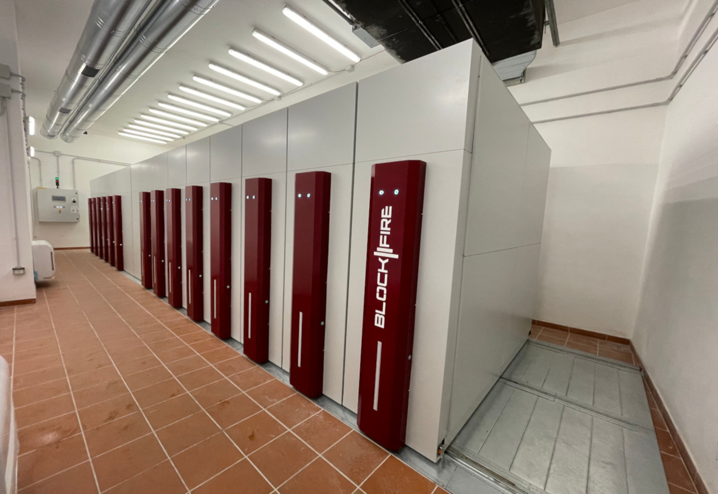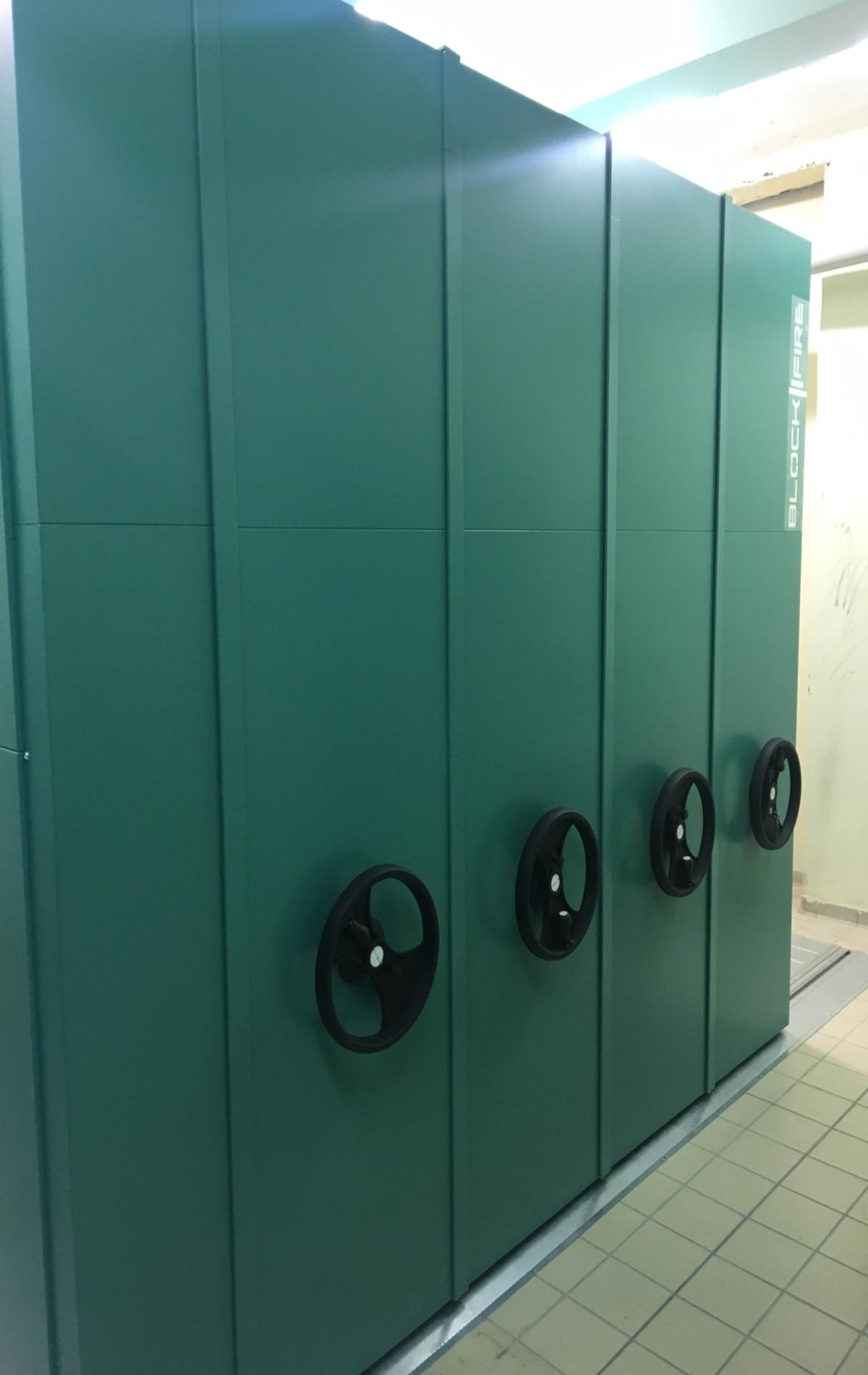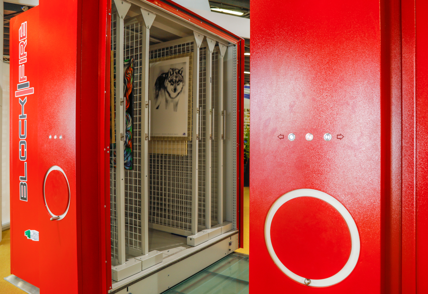 Si tratta fondamentalmente di un contenitore a scompartimenti chiusi: è un grande cubo, formato da una serie di armadi, che quando si ha necessità di entrare si apre manualmente o elettronicamente. All’interno degli archivi non c’è alternanza di scaffali e corridoi, si spostano compattandosi e dando accesso ad uno scaffale per volta all’apertura. Così il risparmio di spazio è assicurato e se dovesse intervenire un incendio, ognuno di questi contenitori è comunque chiuso singolarmente con un guscio in fibra di nostra invenzione. Tra gli armadi chiusi rimane uno spazio minimo per consentire il ricircolo di aria, li in mezzo una guarnizione intumescente, cioè che si espande molto velocemente a causa dell’esposizione al calore, va a sigillare i punti di contatto creando tante camere stagne in caso di incendio.