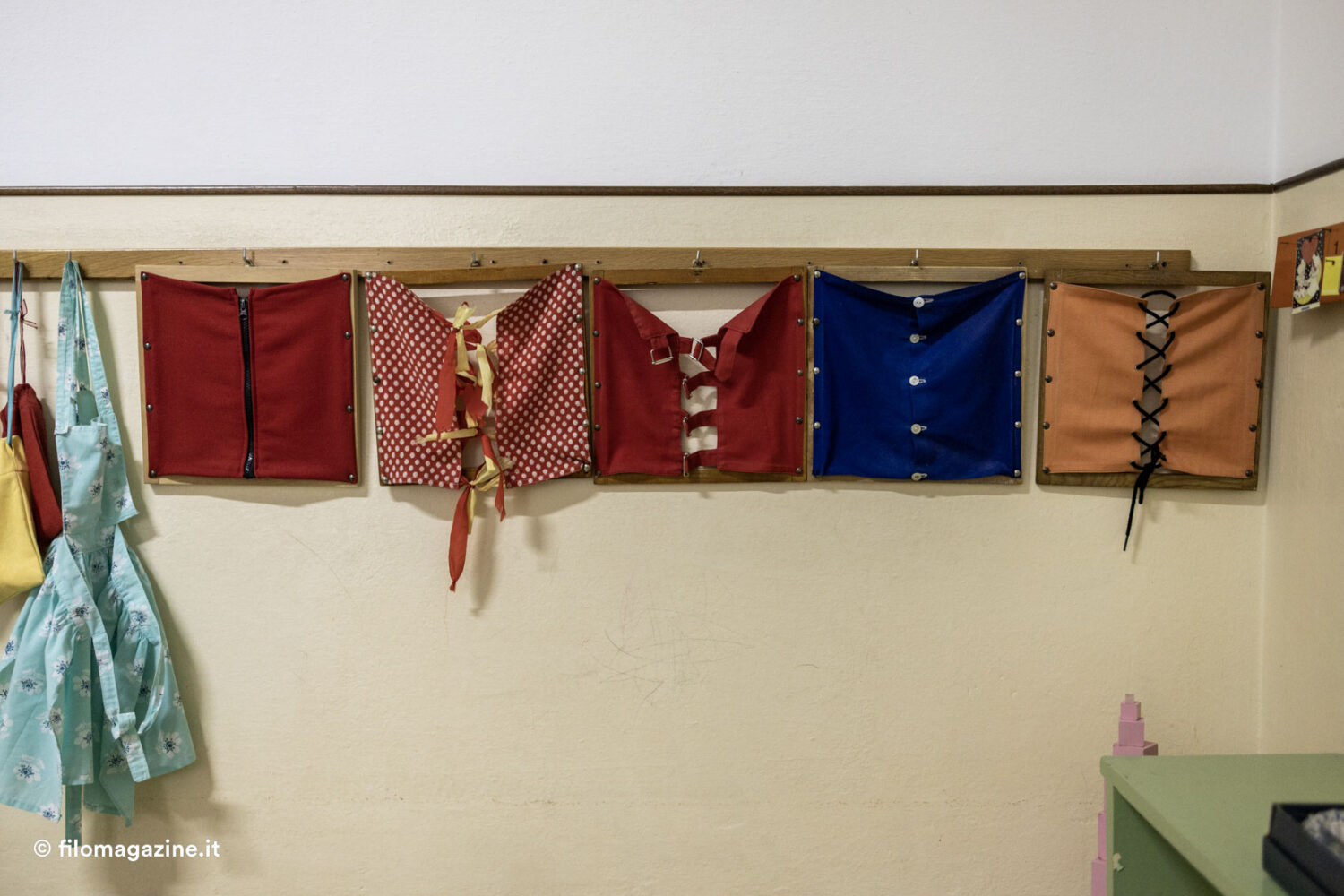 Tra gli oggetti di utilizzo quotidiano per la didattica troviamo la stessa dotazione grossomodo identica in ogni aula: forme che se percorse con le dita insegnano come scrivere le lettere dell’alfabeto, strumenti che rispondono a stimolazioni sonore, puzzle geografici per imparare stati o regioni del mondo, figurine tematiche di insetti, segnali stradali, animali e altri argomenti dello scibile umano, dove collegare immagini alle rispettive parole che li identificano, e ancora assi da stiro in miniatura, spazzolone e attaccapanni per simulare ed apprendere perfino la vita casalinga. Ogni angolo è organizzato per tematiche a cui i bambini accedono liberamente e in cui scoprono la sperimentazione.
