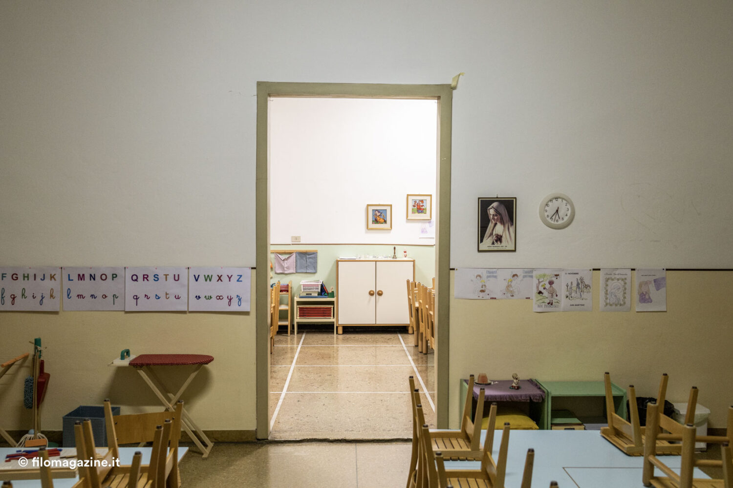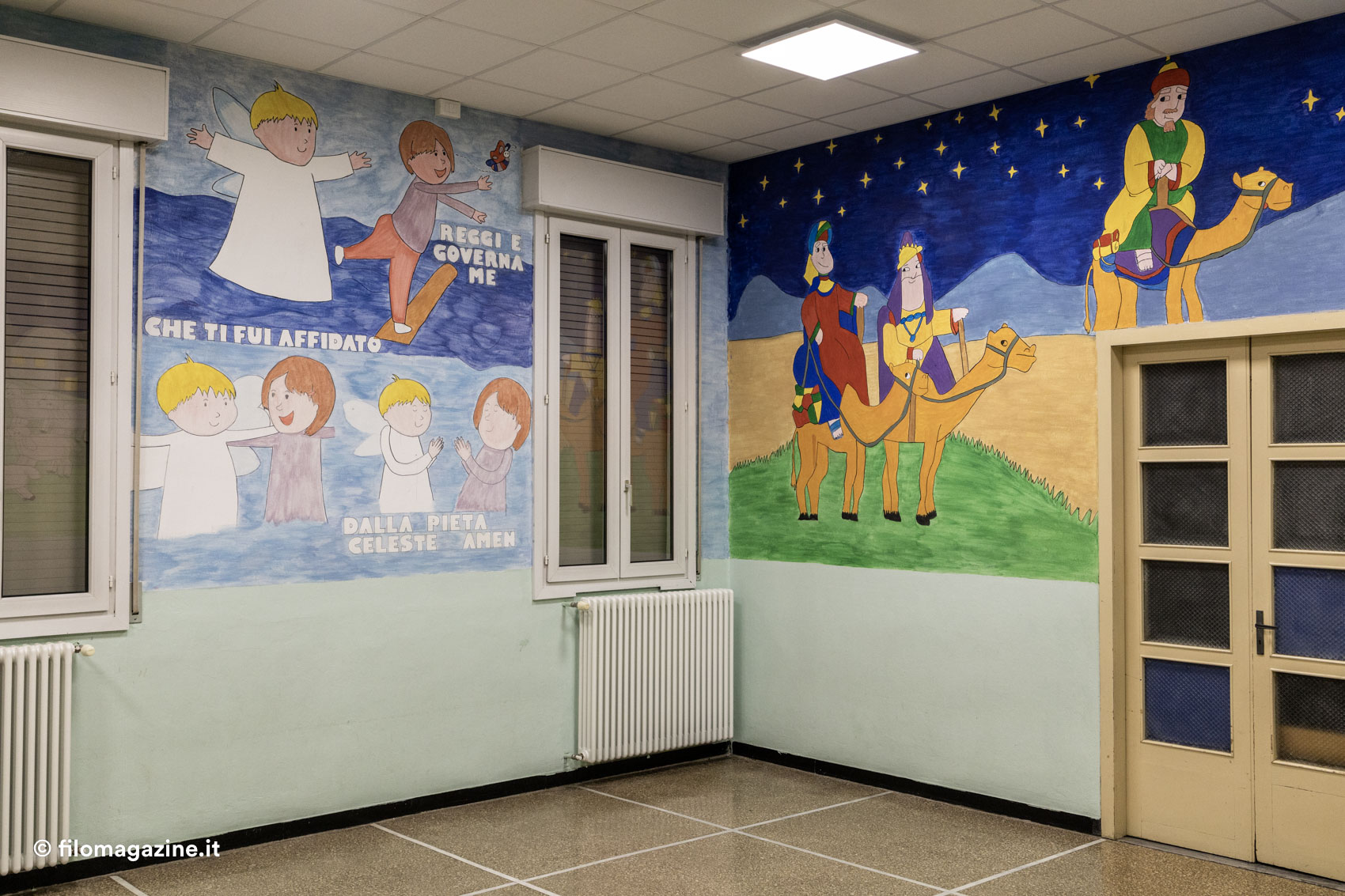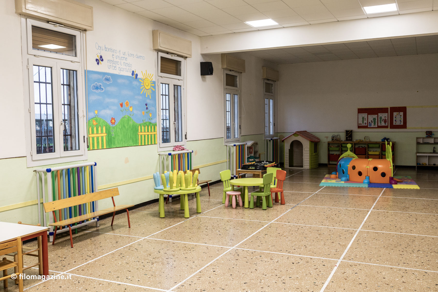 La scuola nasce infatti nel 1956, su sollecitazione del parrocco Don Adriano Benvenuti, con l’apporto fondamentale delle Suore Domenicane, che per diversi decenni hanno lavorato in questa struttura (dopo la loro partenza poco più di dieci anni fa, sono arrivate in supporto tre Suore sempre dell’ordine Domenicano di origine filippina, che lavorano e vivono all’interno della scuola) e il prodotto finale è qualcosa di simile eppure diverso dalle altre scuole dell’infanzia. Spazi ampi, arredi a portata di bambino, le classi allineate e divise tra loro da porte sempre aperte al centro della stanza, in modo che tutte le insegnanti si possano sempre vedere e comunicare senza allontanarsi dai bambini, creando il contesto per un ambiente collaborativo e che lavora in gruppi, ma che vuole assomigliare ad una comunità.