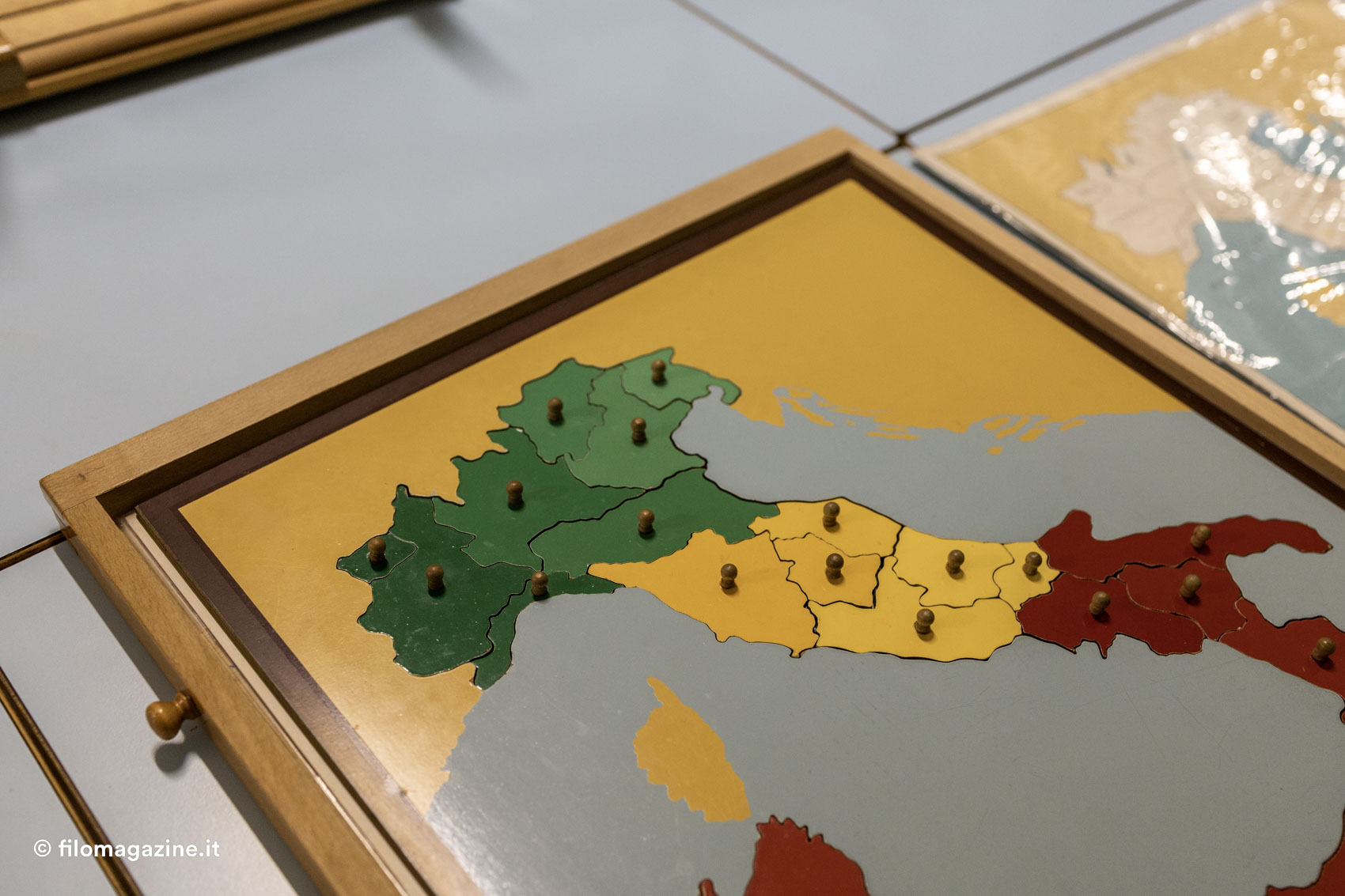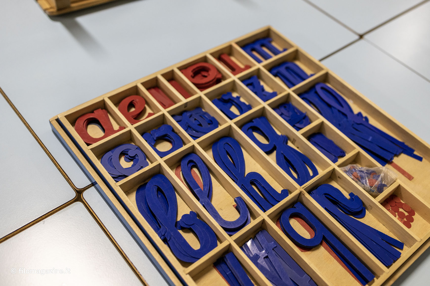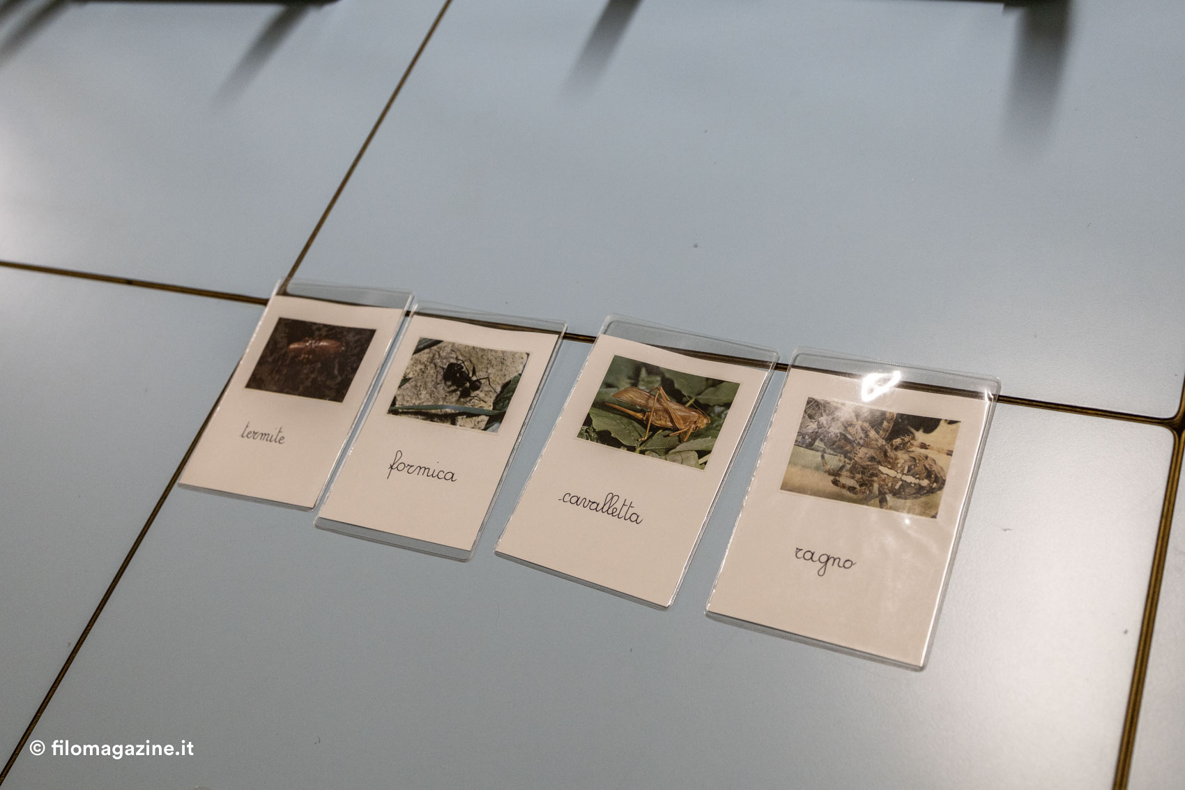 Tra gli oggetti di utilizzo quotidiano per la didattica troviamo la stessa dotazione grossomodo identica in ogni aula: forme che se percorse con le dita insegnano come scrivere le lettere dell’alfabeto, strumenti che rispondono a stimolazioni sonore, puzzle geografici per imparare stati o regioni del mondo, figurine tematiche di insetti, segnali stradali, animali e altri argomenti dello scibile umano, dove collegare immagini alle rispettive parole che li identificano, e ancora assi da stiro in miniatura, spazzolone e attaccapanni per simulare ed apprendere perfino la vita casalinga. Ogni angolo è organizzato per tematiche a cui i bambini accedono liberamente e in cui scoprono la sperimentazione.