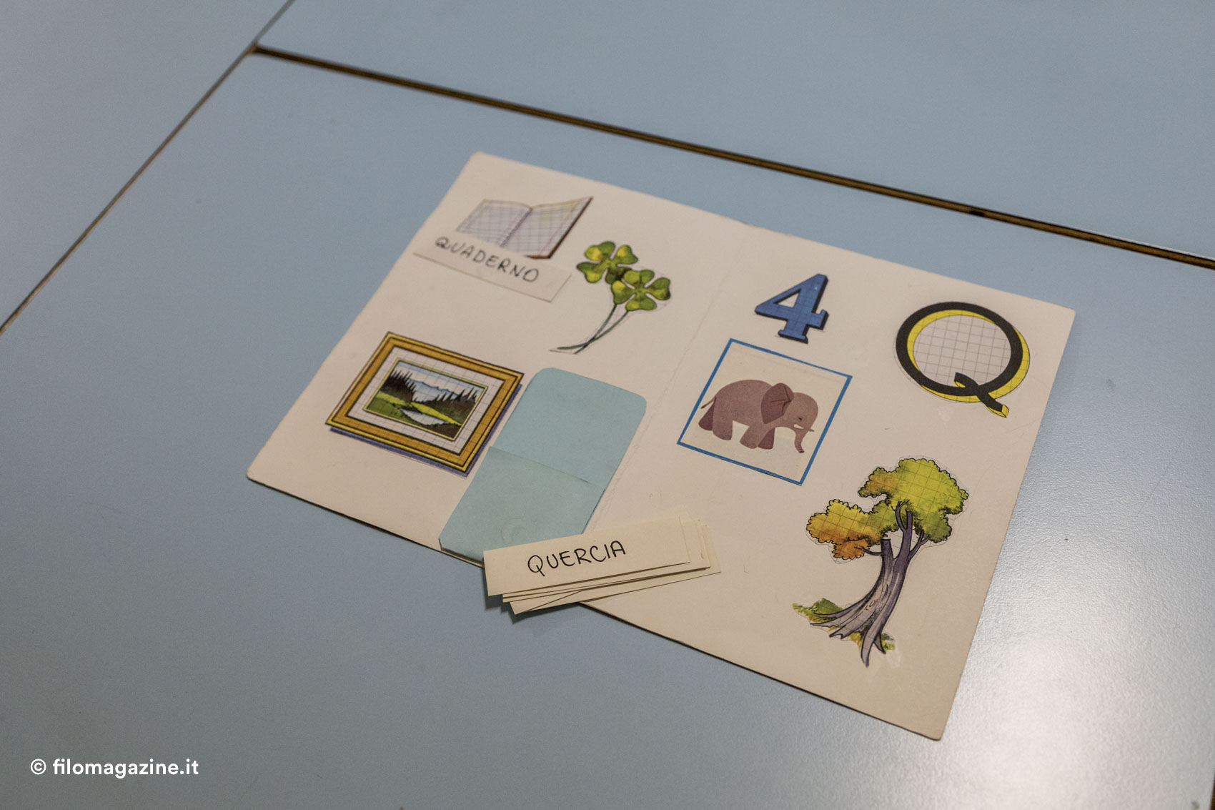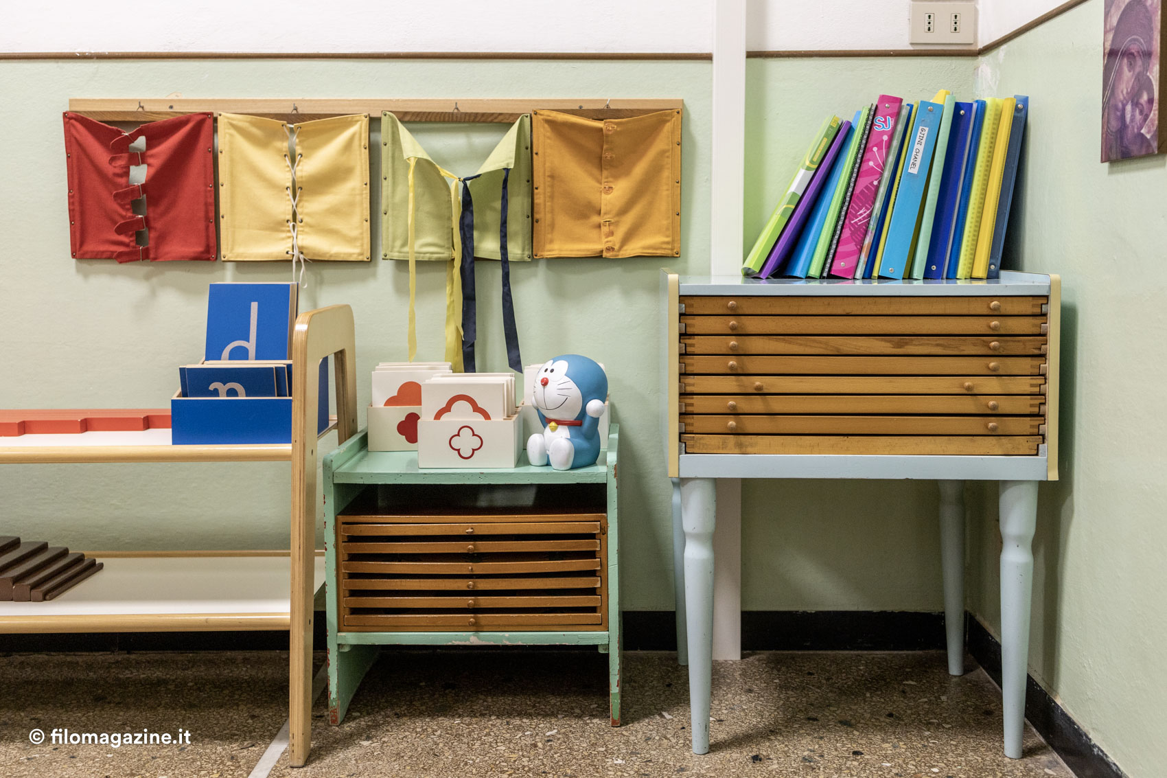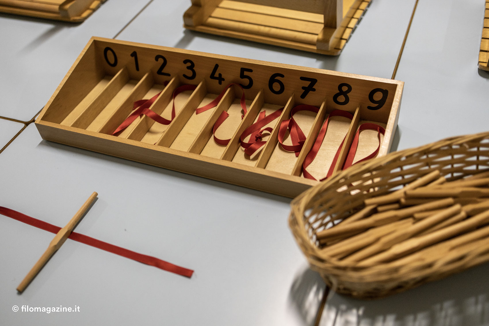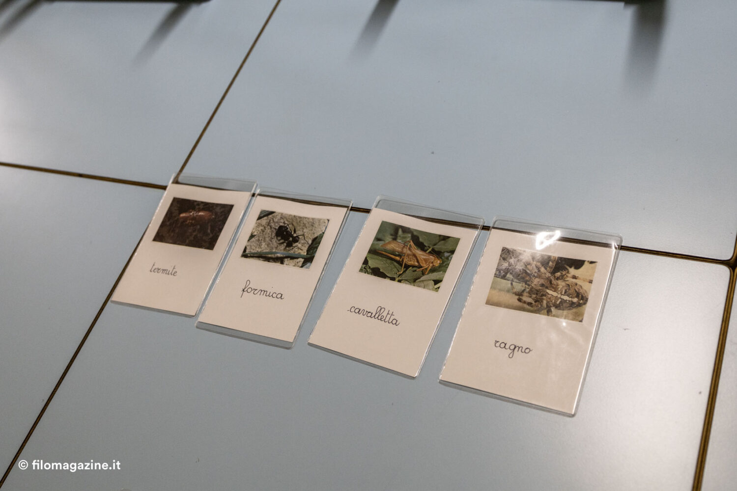 Tra gli oggetti di utilizzo quotidiano per la didattica troviamo la stessa dotazione grossomodo identica in ogni aula: forme che se percorse con le dita insegnano come scrivere le lettere dell’alfabeto, strumenti che rispondono a stimolazioni sonore, puzzle geografici per imparare stati o regioni del mondo, figurine tematiche di insetti, segnali stradali, animali e altri argomenti dello scibile umano, dove collegare immagini alle rispettive parole che li identificano, e ancora assi da stiro in miniatura, spazzolone e attaccapanni per simulare ed apprendere perfino la vita casalinga. Ogni angolo è organizzato per tematiche a cui i bambini accedono liberamente e in cui scoprono la sperimentazione.