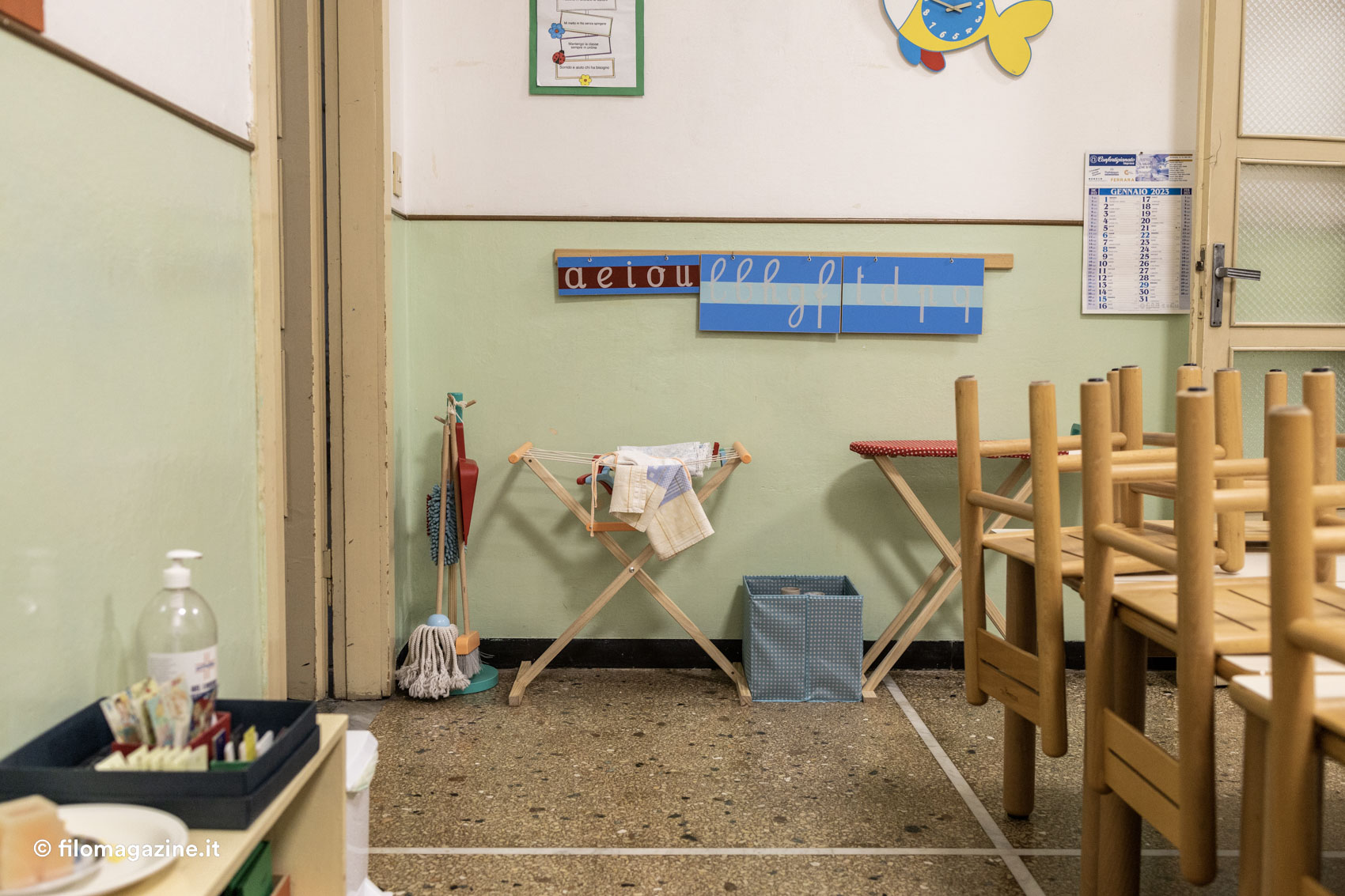 “Tenendo la base dello slogan “aiutami a fare da solo”, nella nostra scuola sono i bambini a prendersi cura degli spazi. Dalla presenza di telai a muro per imparare ad allacciare vestiti e scarpe, agli specchi in bagno per osservarsi se si è in ordine, fino alla classi divise in gruppi ma di età mista, perché siano i più grandi a fare da guida ai più piccoli.
