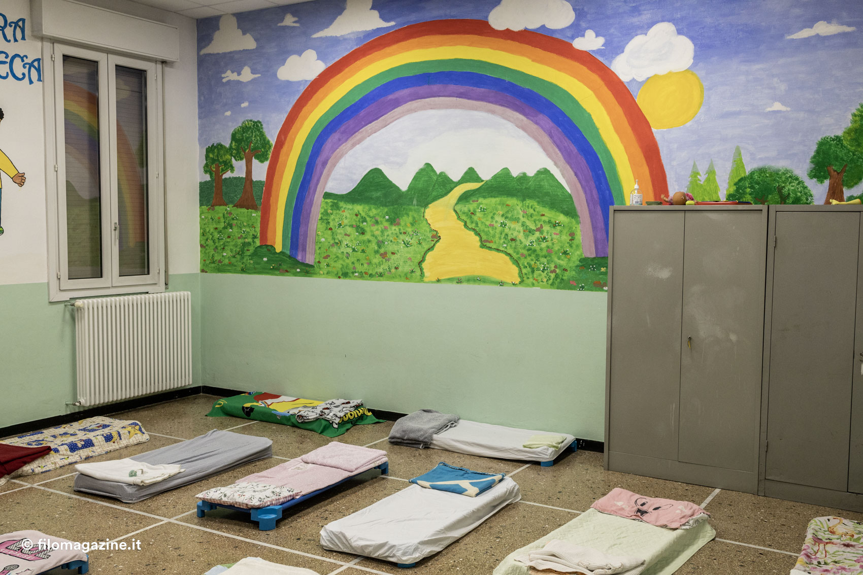 Così come la grande mensa comune o l’area di gioco e accoglienza, dove si vedono tantissimi giochi, contenitori e strumenti di stimolo a libero uso dei bambini, perfettamente organizzati per argomento, utilizzo e materiale.