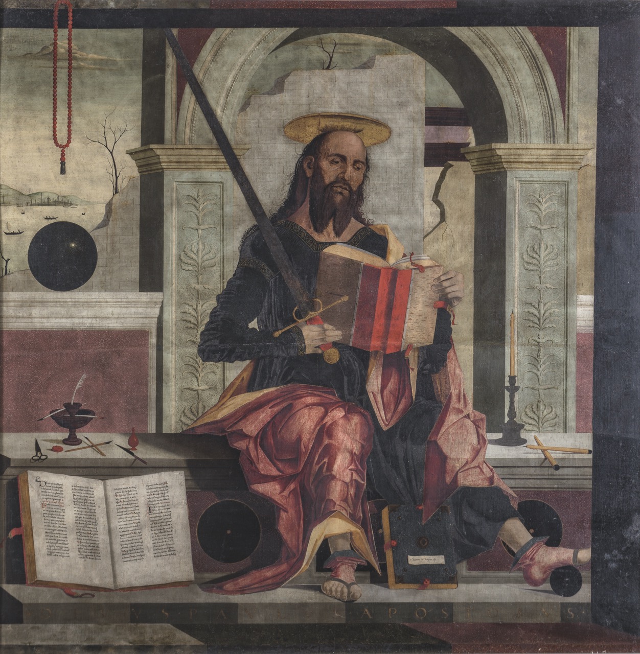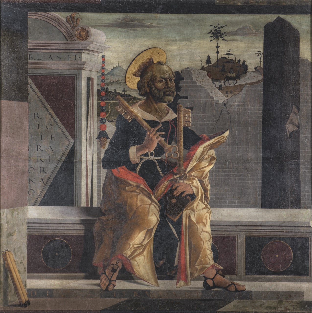 Le tre tele sono magnifiche e di una potenza inusitata, riassumono alcune delle più importanti caratteristiche del pittore, nonché musico, considerato bizzarro e insolito, correlate al registro della luce/ombra. Una Madonna stanca e i Santi sono impersonificati entro una cornice di marmi policromi, come racchiusi in un contenitore o in una scatola. Fin dall’origine dell’iconografia cristiana, i due apostoli sono stati tra i primi ad avere una rappresentazione propria. Nella tela di San Paolo si nota un libro aperto a fianco al santo, dove si può leggere una parte dell’epistola del santo ai Corinzi e un momento del Vangelo di San Matteo. Un elemento sorprendente è la straordinaria sfera – elemento di astrazione – sospesa sotto l’oscillante collana di corallo, che si ritrova pure sotto il piede di Paolo. Piccola curiosità: Ovidio racconta che il corallo sarebbe nato dalle gocce del sangue colato dalla testa di Medusa, adagiata da Perseo su una spiaggia, nello specifico su uno strato di ramoscelli marini. La parte con San Pietro contiene la firma, criptica, dell’artista che può essere decifrata solo facendo l’anagramma delle lettere disposte in modo casuale sul sarcofago dietro alla figura del santo, che formano il nome Antonio Leonelli Crevalcore.