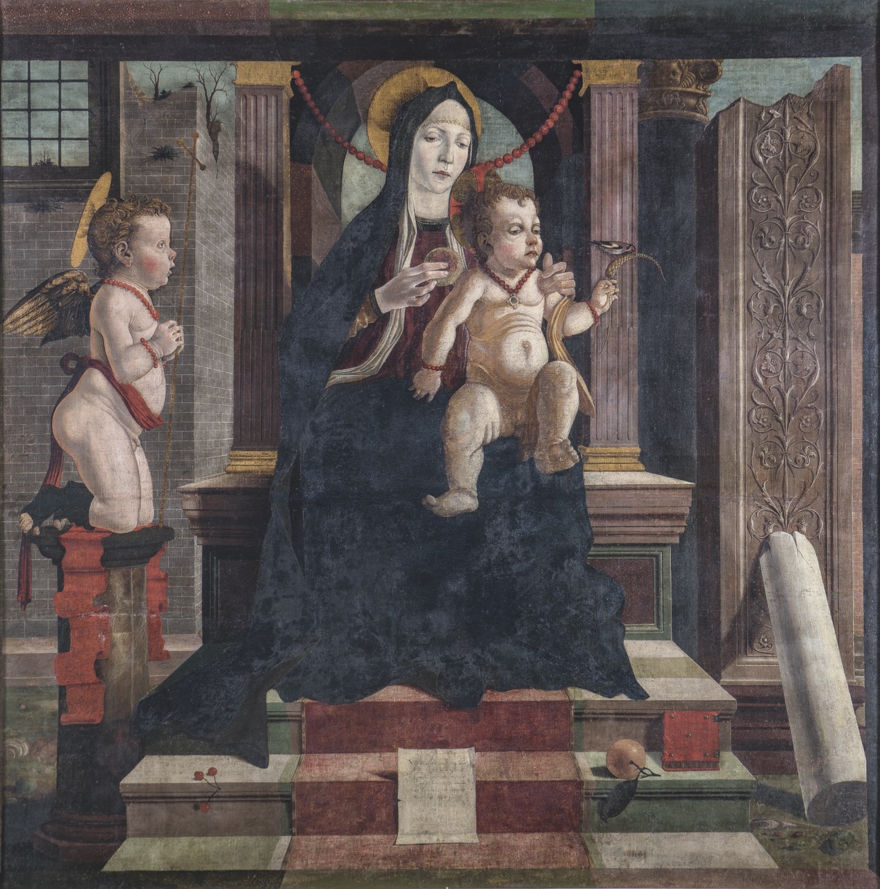 Tura raffigura la Vergine al di là di un parapetto marmoreo, intenta a svegliare il piccolo Gesù immerso nel sonno, che prefigura il suo destino di morte e di resurrezione. Il pittore rafforza questo duplice asse e incide nella parte bassa della tavola la scritta Sviglia el tuo figlio dolce madre pia/per far infin felice l’anima mia. Alludono a tale doppia tematica, pure i picchi muraioli posti sui due grappoli d’uva che pendono dal tralcio di vite che attraversa, come “una sorta di naturalistico festone” la parte superiore della tavola, dove si notano altresì un paio di cardellini. Tutti elementi correlati alla Passione: l’uva come rimando al sangue di Cristo, mentre il cardellino è simbolo della sua resurrezione (piccola curiosità sul suo becco rosso: si narra che si macchiò nel tentativo di estrarre le spine dalla corona di Cristo). La figura della Vergine è contornata dai segni zodiacali, visibili soltanto in parte, in riferimento al ruolo di Cristo come signore del tempo cosmico oppure al peculiare interesse della corte estense per l’astrologia. La composizione, di cui rimane ignota l’originaria destinazione e che presenta un colore poco vibrante, esprime un’ineffabile tenerezza ed emozione.