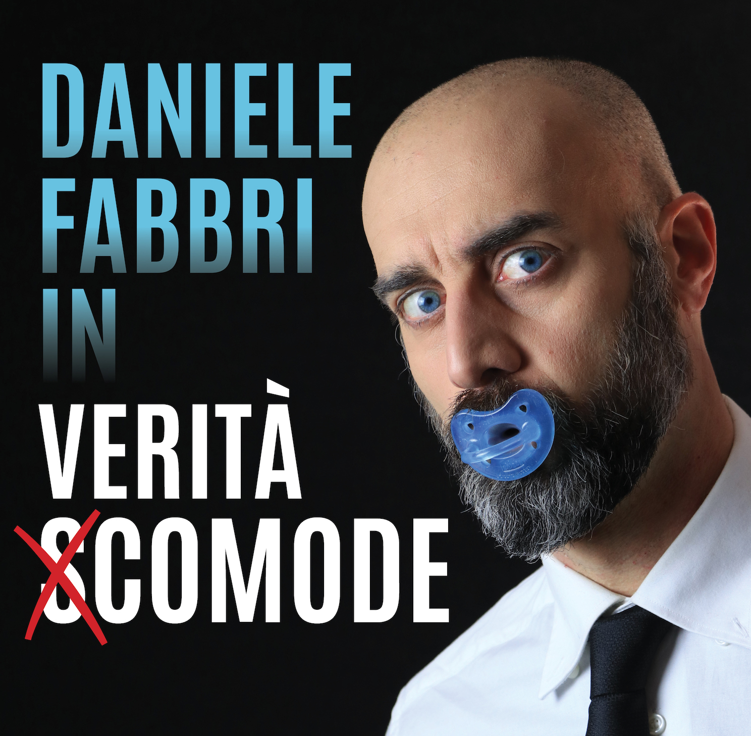 Fabbri torna in scena dopo un anno lontano dal palco, con un nuovo spettacolo che inaugura proprio a Ferrara (ricordiamolo, di venerdì 17). Il titolo è ‘Verità comode’, con una bella ‘s’ cancellata da una croce rossa un po’ splatter e un omaggio fotografico alla locandina di ‘Trentatrè Trentenni’, suo spettacolo datato 2013.