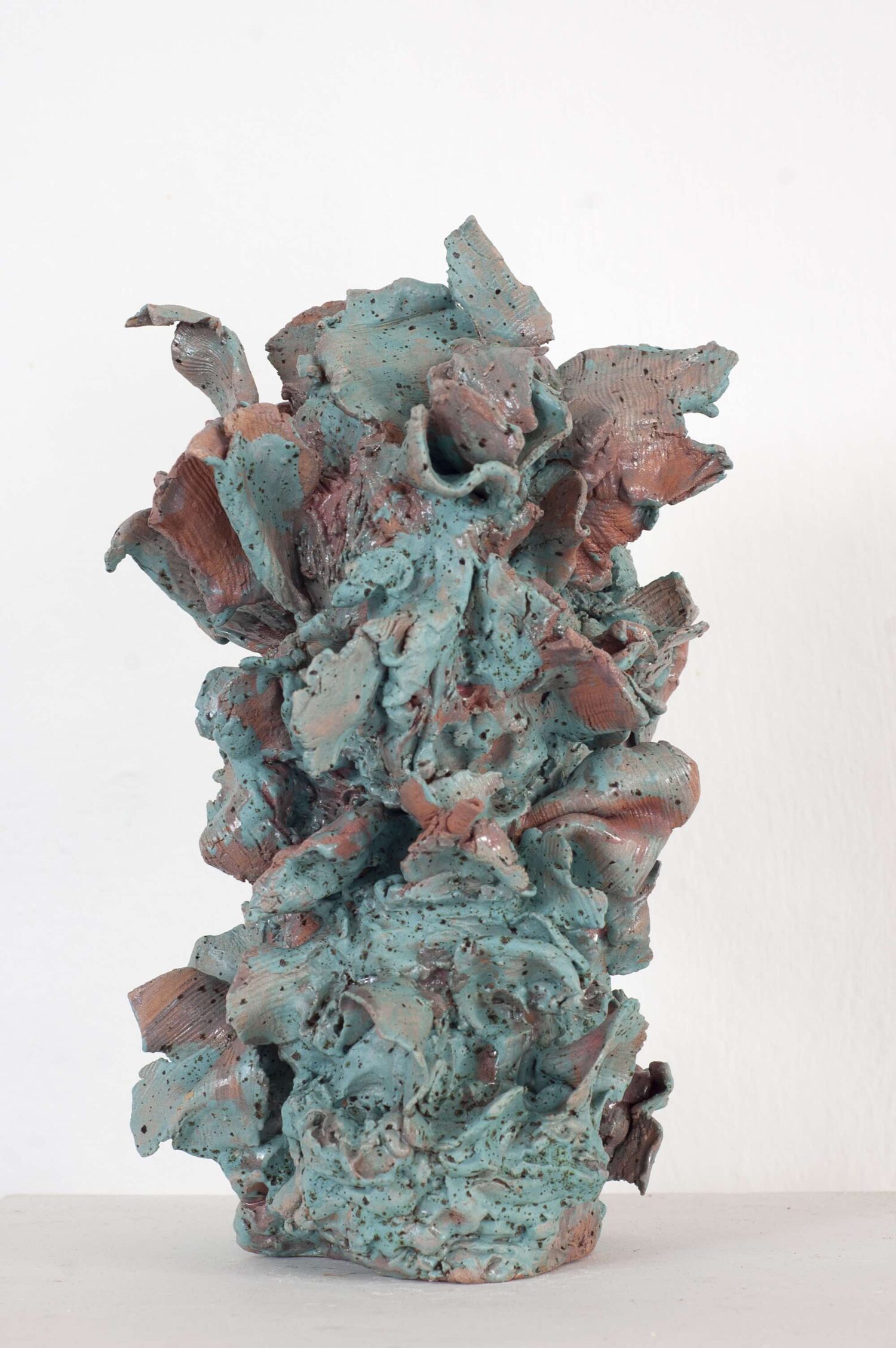 Gli artisti raffigurano un mondo diverso, creato dopo un’esplosione, e immaginano un’ipotesi di vita possibile. Un paesaggio distrutto, quasi un fondale, popolato da esseri ibridi, un po’ ancestrali, che prendono forme inedite, un combo tra esseri marini e oggetti musicali (come altresì le sculture in mostra nella stanza adiacente). Per adattarsi a questo nuovo scenario, l’uomo deve migliorare, inglobare questo mutamento e trasformarsi, assumere un’altra forma, diventando parte della natura e imparare a coabitare con essa.