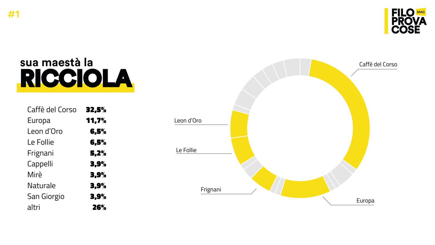 Diciamocelo, quello della Ricciola è un momento appagante; la domenica mattina, con il sole ancora tiepido, la piazza semivuota e i passi pesanti sotto la pigrizia tipica del weekend. C’è chi ha un bar di fiducia, sempre rigorosamente lo stesso, e chi ama cambiare lasciandosi trasportare dalle necessità del momento. Gli affezionati, quelli del bar del cuore, spesso sono anche quelli del ‘solito’ che il barista anticipa con sicurezza e il sorriso soddisfatto; ma non è detto che i girovaghi, i coraggiosi tester, non siano comunque abitudinari quando si tratta di ordinare al bancone ‘Ricciola e caffè’, o ‘Ricciola e cappuccio’, (per i più temerari a una certa anche ‘Ricciola e spritz’).