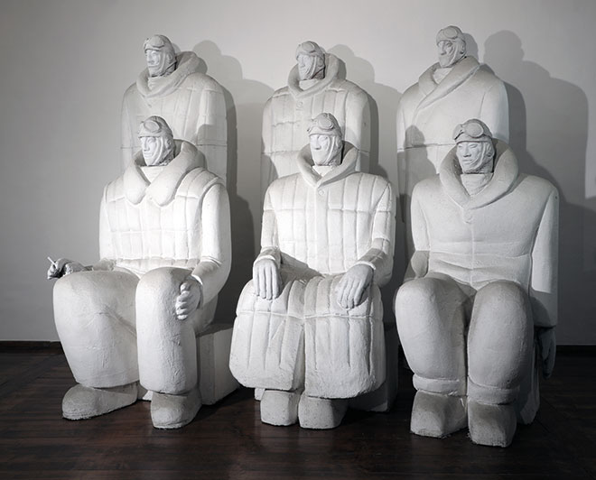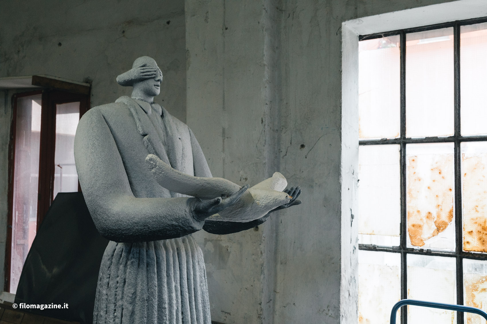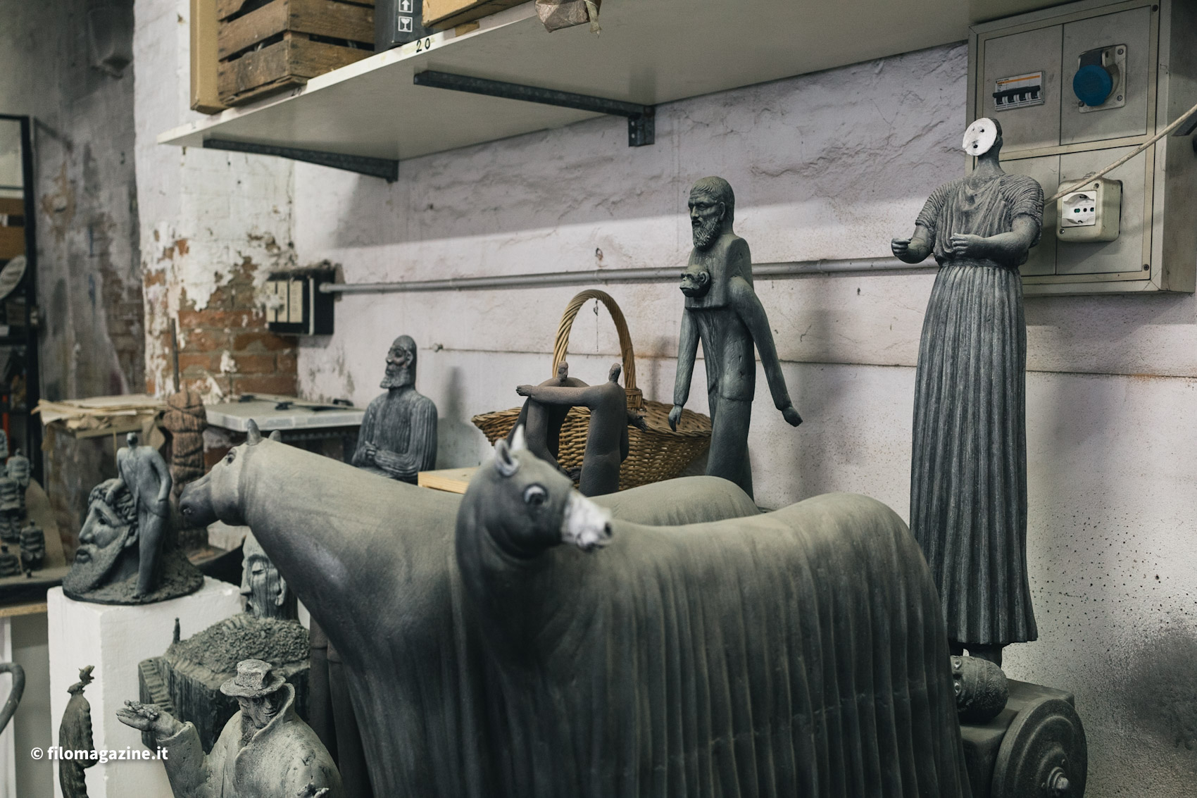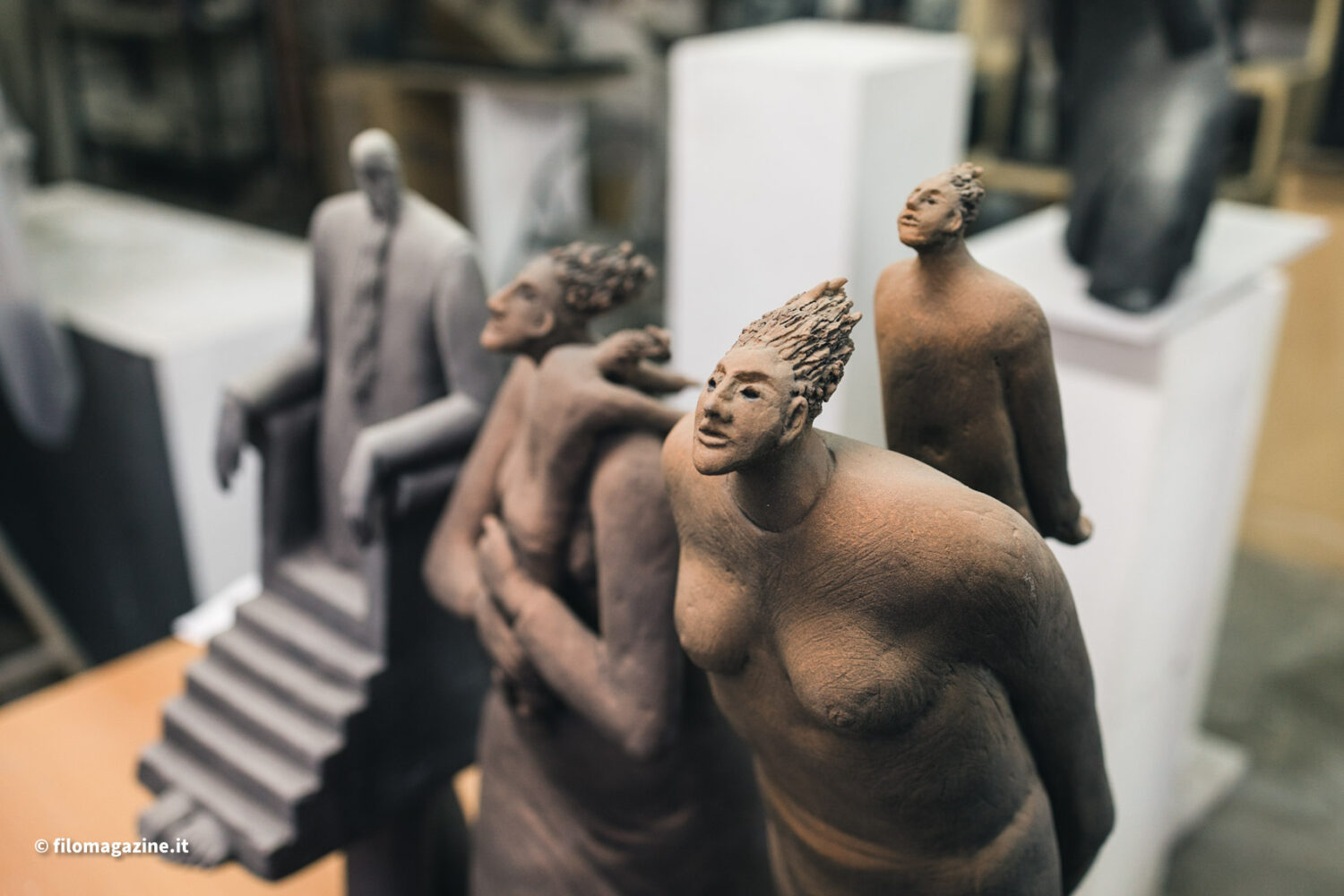 Il desiderio di introdurre nuove figure, spesso di grandi dimensioni, per me ha coinciso con la necessità di provare elementi diversi, anche più pratici da produrre rispetto alla terracotta. Per esempio, grazie alla sperimentazione di altri materiali, sono riuscito a realizzare Foto di gruppo, un complesso scultoreo di sei figure in polistirolo, donato alla città di Ferrara nel 2022 e attualmente esposto nel Salone d’Onore del Palazzo Municipale.