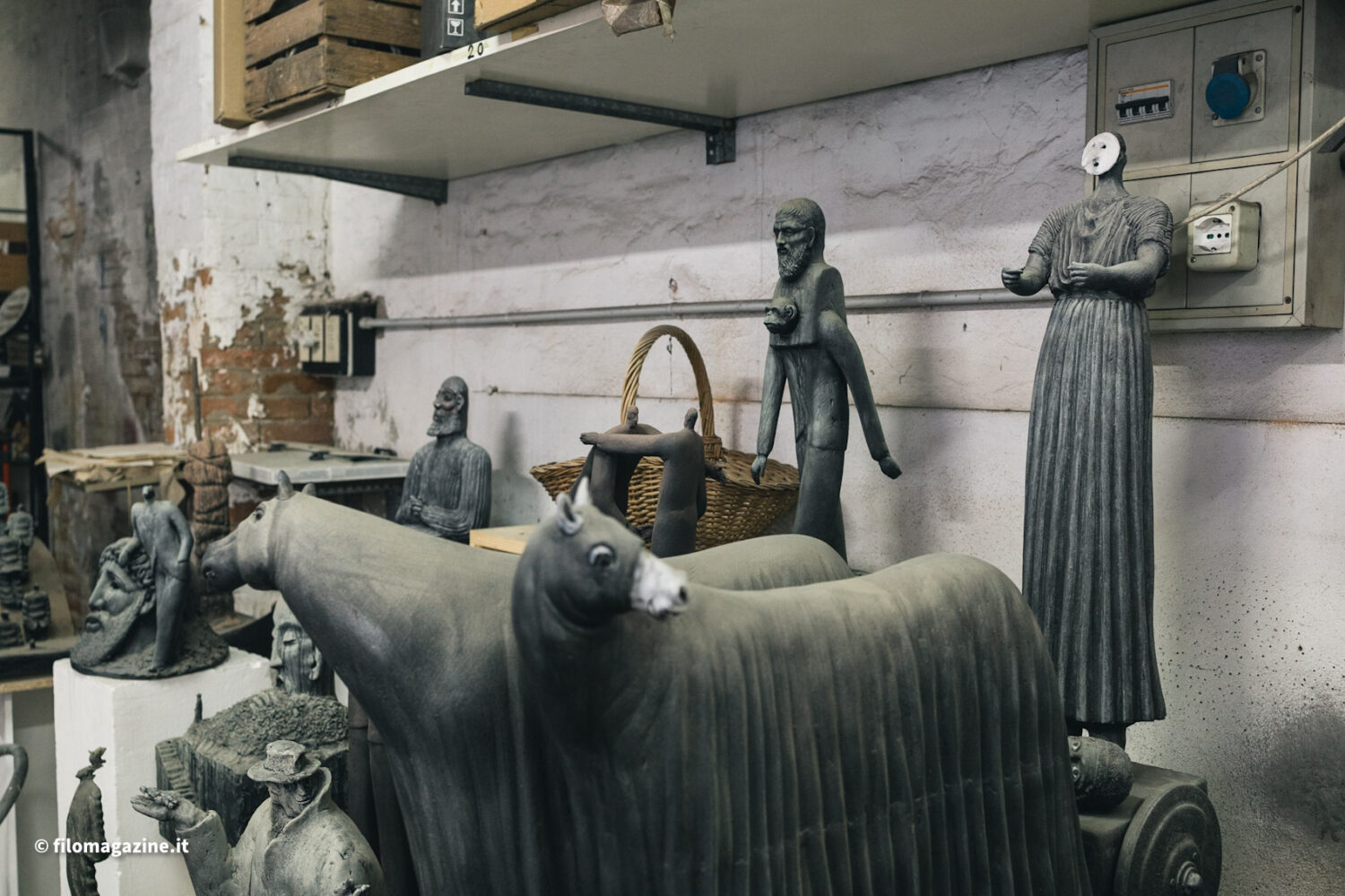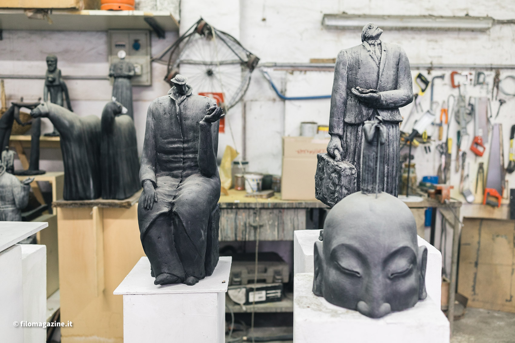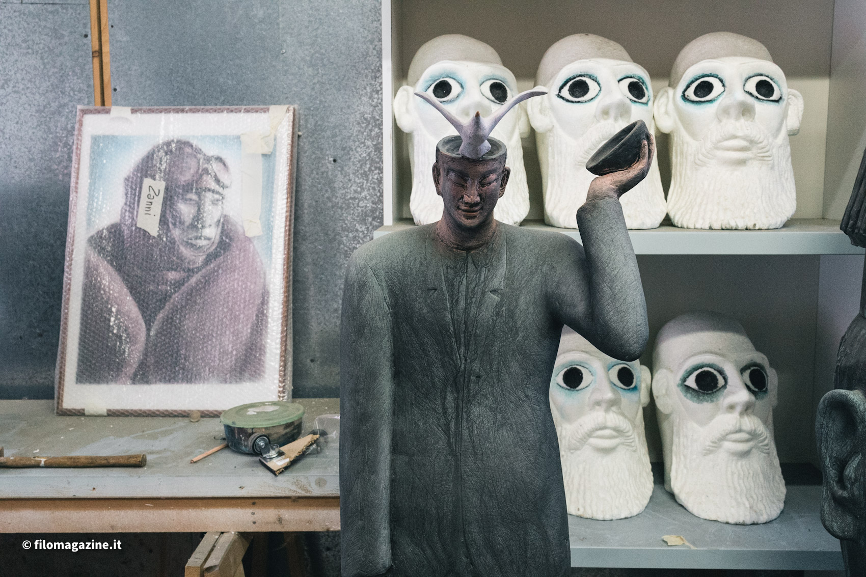 Esordisce così Sergio Zanni durante il nostro incontro nel suo meraviglioso studio d’artista, colmo di storia, vissuto e arte, una vera e propria officina nascosta nel silenzio del centro storico, tra foto appese alle pareti, colori, sculture, appunti e attrezzi di ogni tipo. L’artista ferrarese, che preferisce definirsi un narratore padano piuttosto che un surrealista padano, è prossimo a celebrare i suoi 81 anni, e di momenti da ricordare ne ha tanti: di lui abbiamo già parlato alcune volte sulle pagine di FILO Magazine, in occasione di mostre personali e collettive, ma abbiamo deciso di raccontare la sua poetica ripercorrendo una lunga carriera di successi. Attraverso la sua arte e servendosi di creta, terracotta, bronzo, carboncino, acquerello ha reso visibile un immaginario ricco e complesso, abitato da viandanti, equilibristi, eremiti, osservatori e molteplici altre figure.