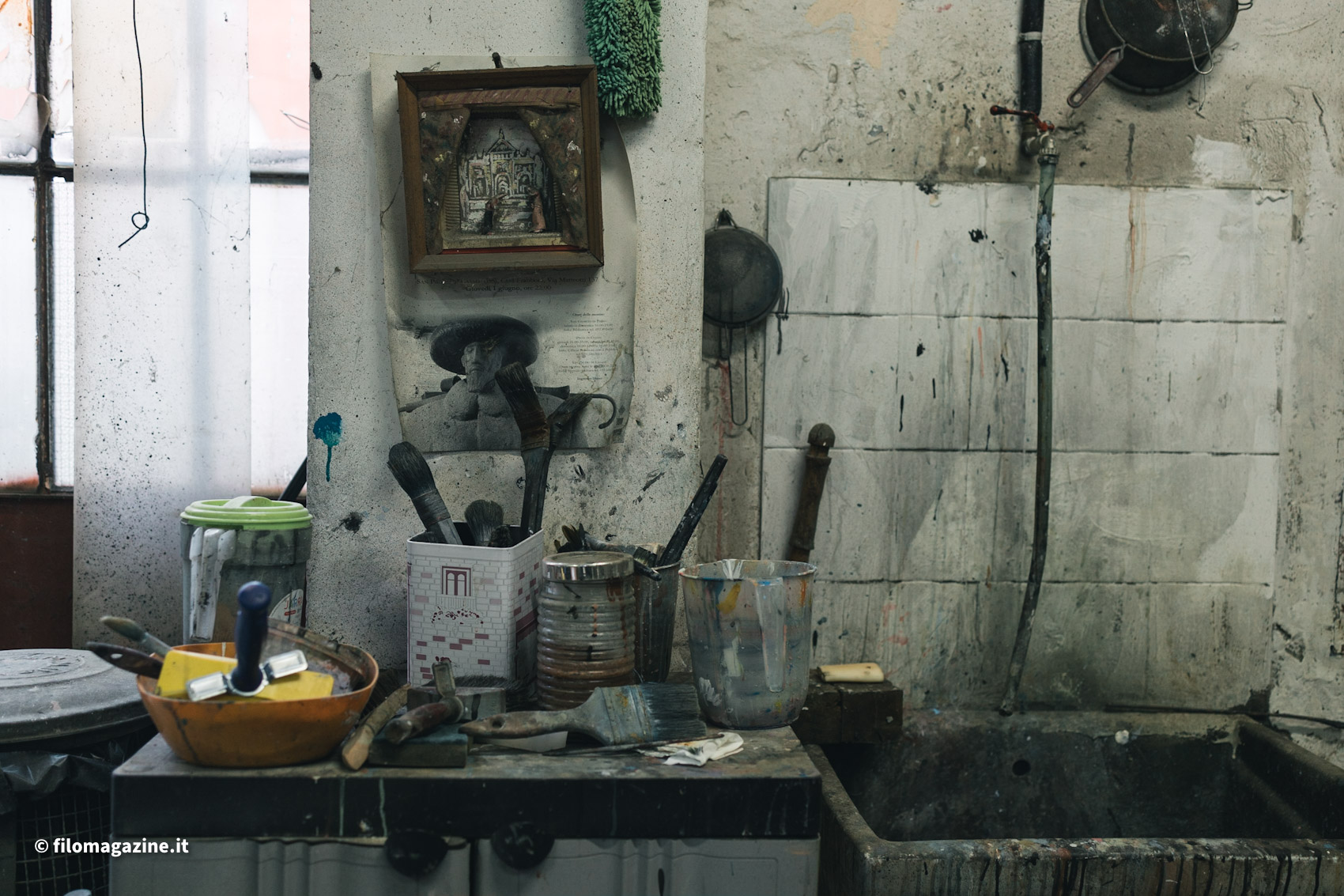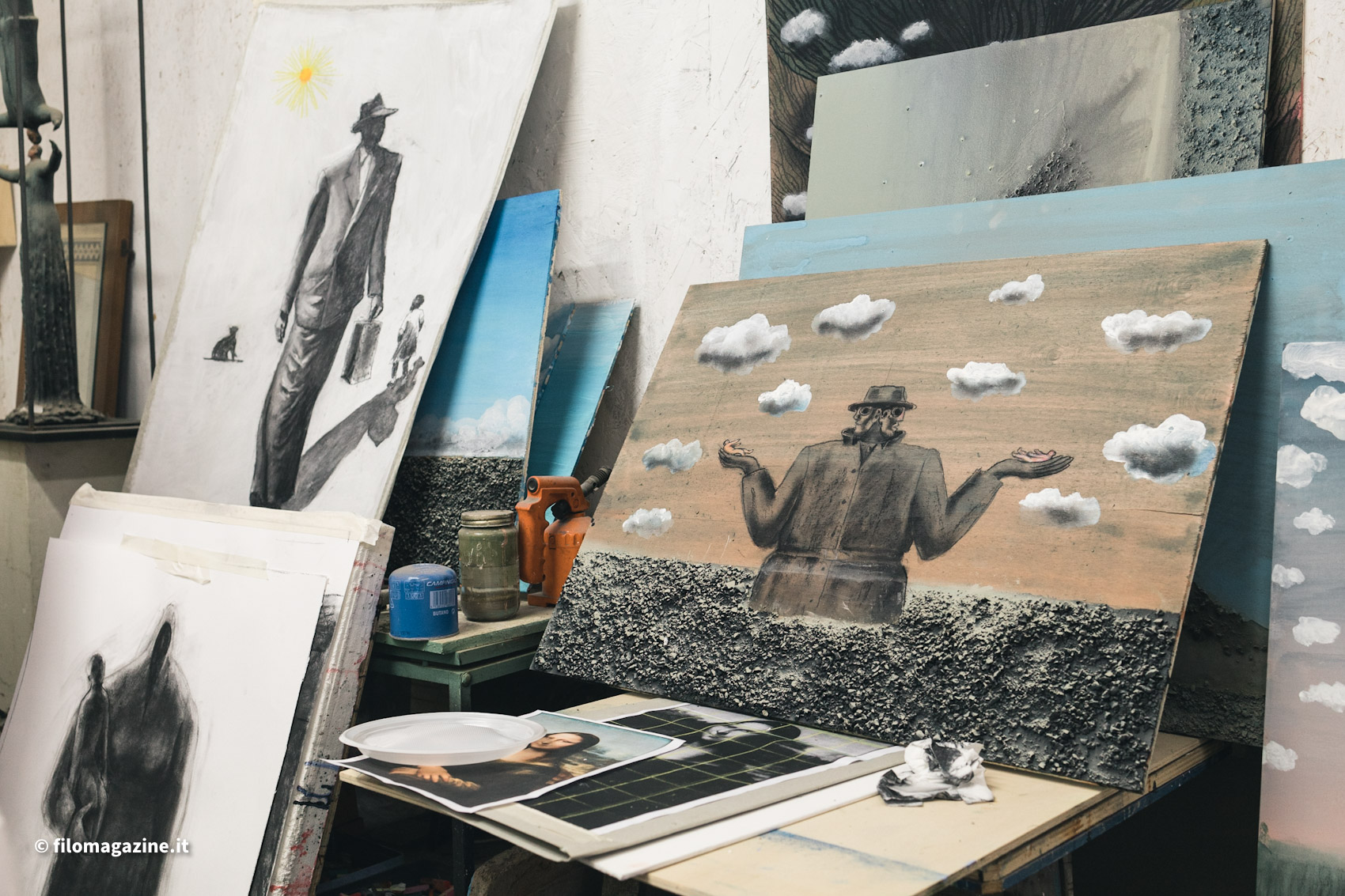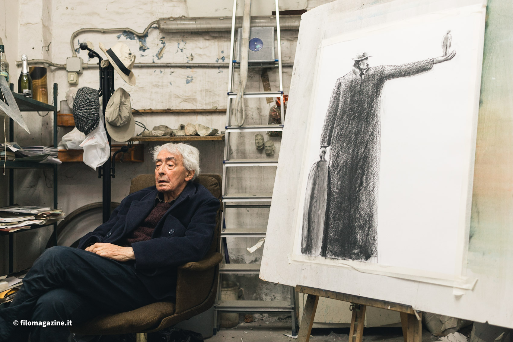 Esordisce così Sergio Zanni durante il nostro incontro nel suo meraviglioso studio d’artista, colmo di storia, vissuto e arte, una vera e propria officina nascosta nel silenzio del centro storico, tra foto appese alle pareti, colori, sculture, appunti e attrezzi di ogni tipo. L’artista ferrarese, che preferisce definirsi un narratore padano piuttosto che un surrealista padano, è prossimo a celebrare i suoi 81 anni, e di momenti da ricordare ne ha tanti: di lui abbiamo già parlato alcune volte sulle pagine di FILO Magazine, in occasione di mostre personali e collettive, ma abbiamo deciso di raccontare la sua poetica ripercorrendo una lunga carriera di successi. Attraverso la sua arte e servendosi di creta, terracotta, bronzo, carboncino, acquerello ha reso visibile un immaginario ricco e complesso, abitato da viandanti, equilibristi, eremiti, osservatori e molteplici altre figure.