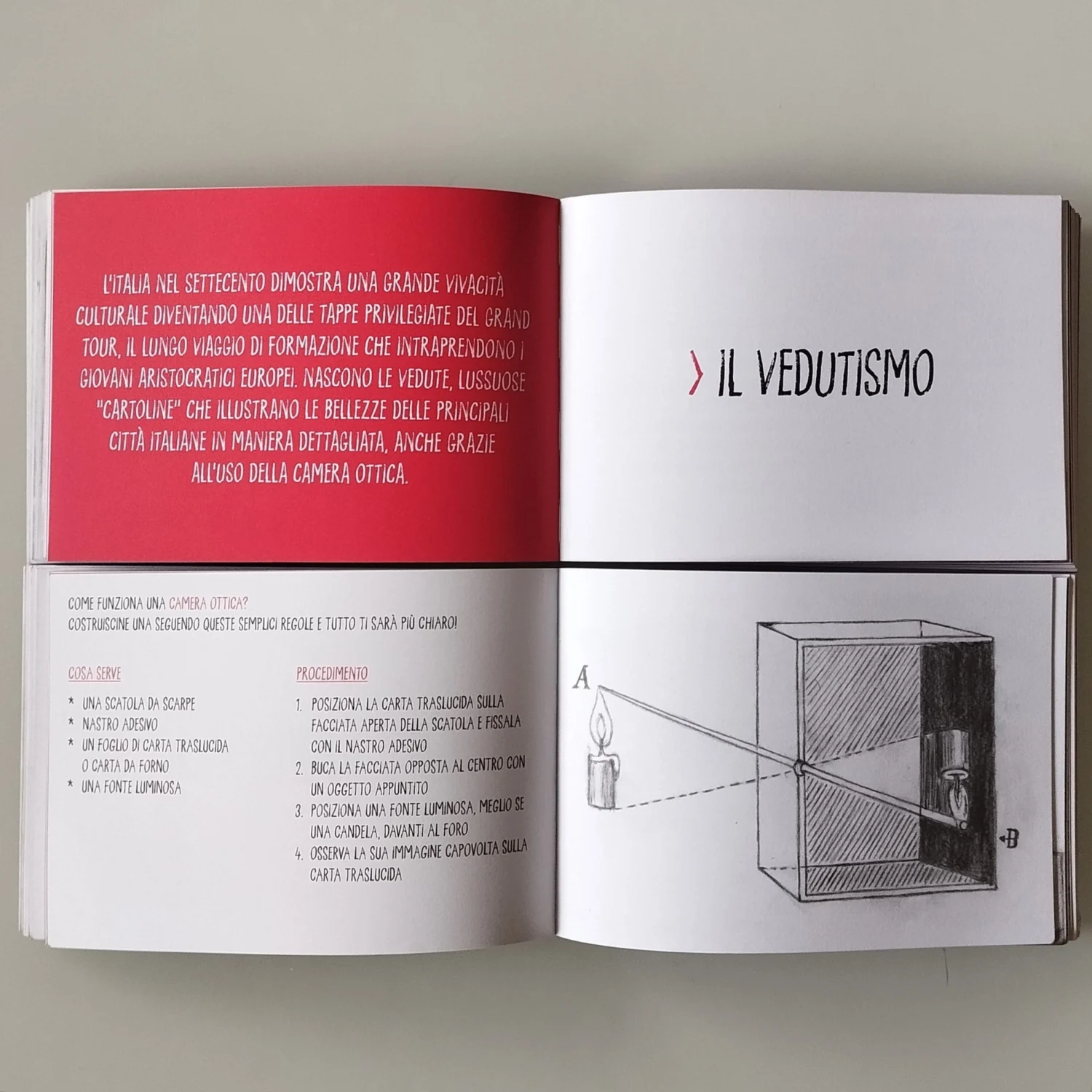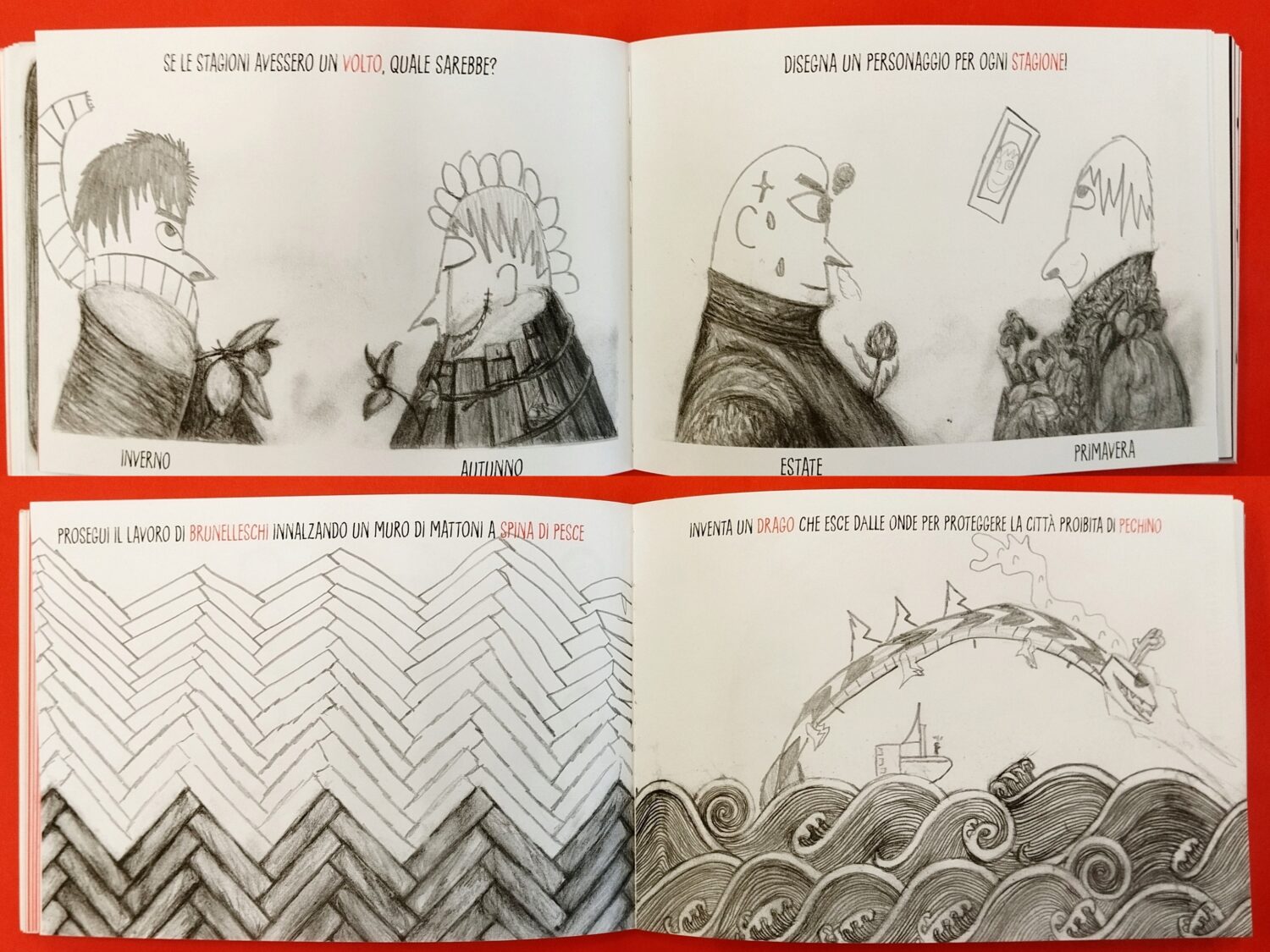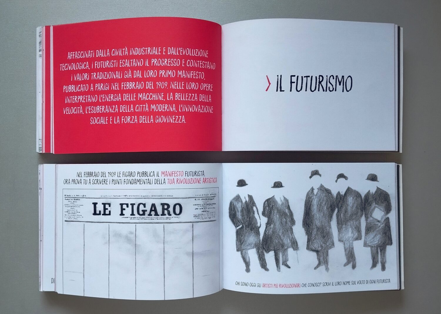Trovare lo stile più adatto per raccontare l’arte dalla preistoria alle prime avanguardie è una sfida enorme, che ha visto l’appoggio e il coinvolgimento della grafica e amica Rossella Merighi. Le prove e i tentativi non sono stati pochi: si è cercato di evitare le pagine bianche, quelle senza testo, che è invece un necessario sostegno alle illustrazioni; perché come dice Meneghini “ogni pagina doveva funzionare indipendentemente, creare suggestioni personali e stimolare nuove idee”.