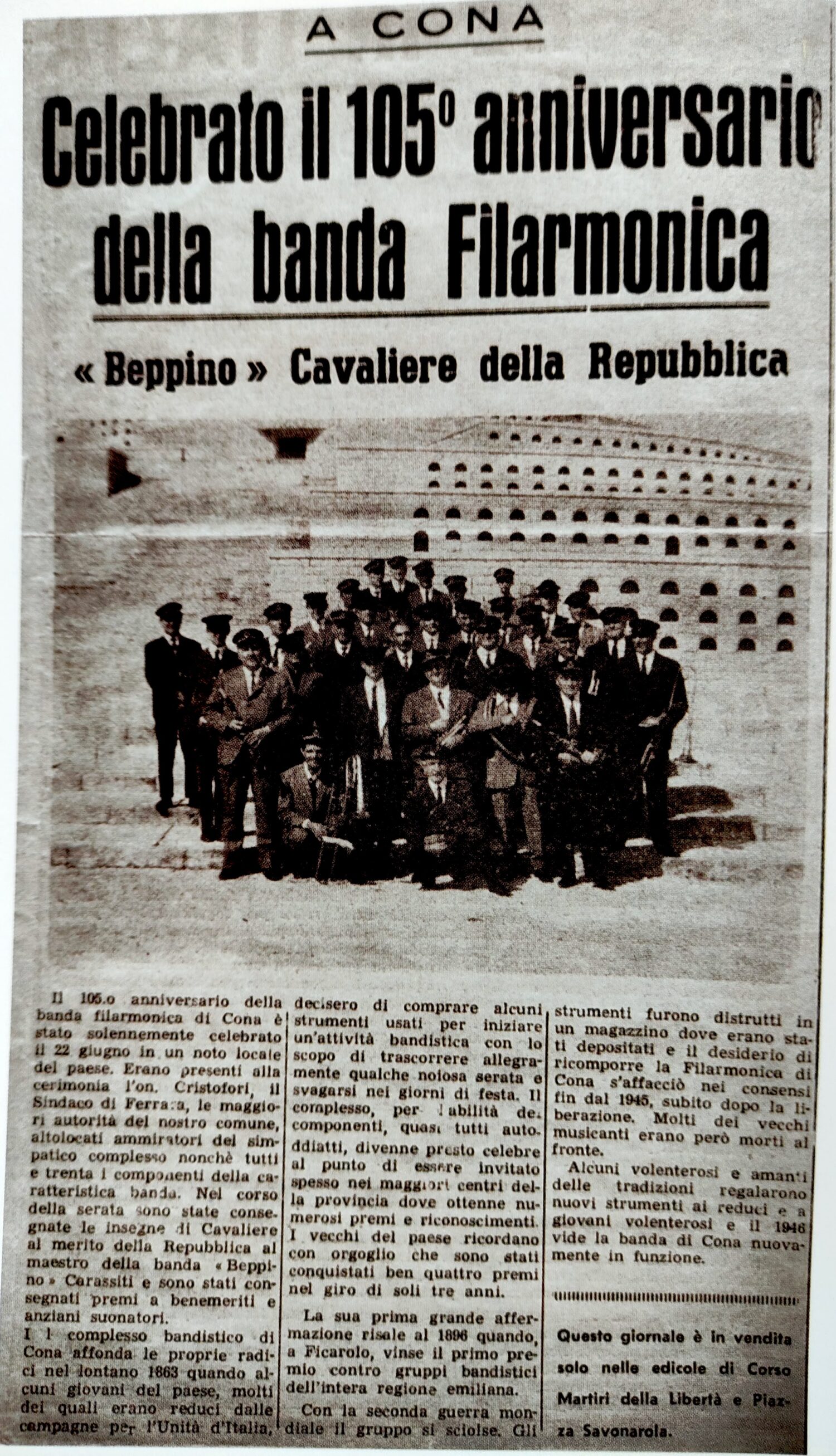 È davvero tanta strada percorsa, da quel 1863 (o 1865, se quello sul primo documento ufficiale era un cinque): su una vecchia “Gazzetta di Ferrara” di qualche anno prima si trova traccia del passaggio di un reggimento militare in città e l’articolista si rammarica di quanto sarebbe stata necessaria la formazione di una banda musicale anche nella nostra città.