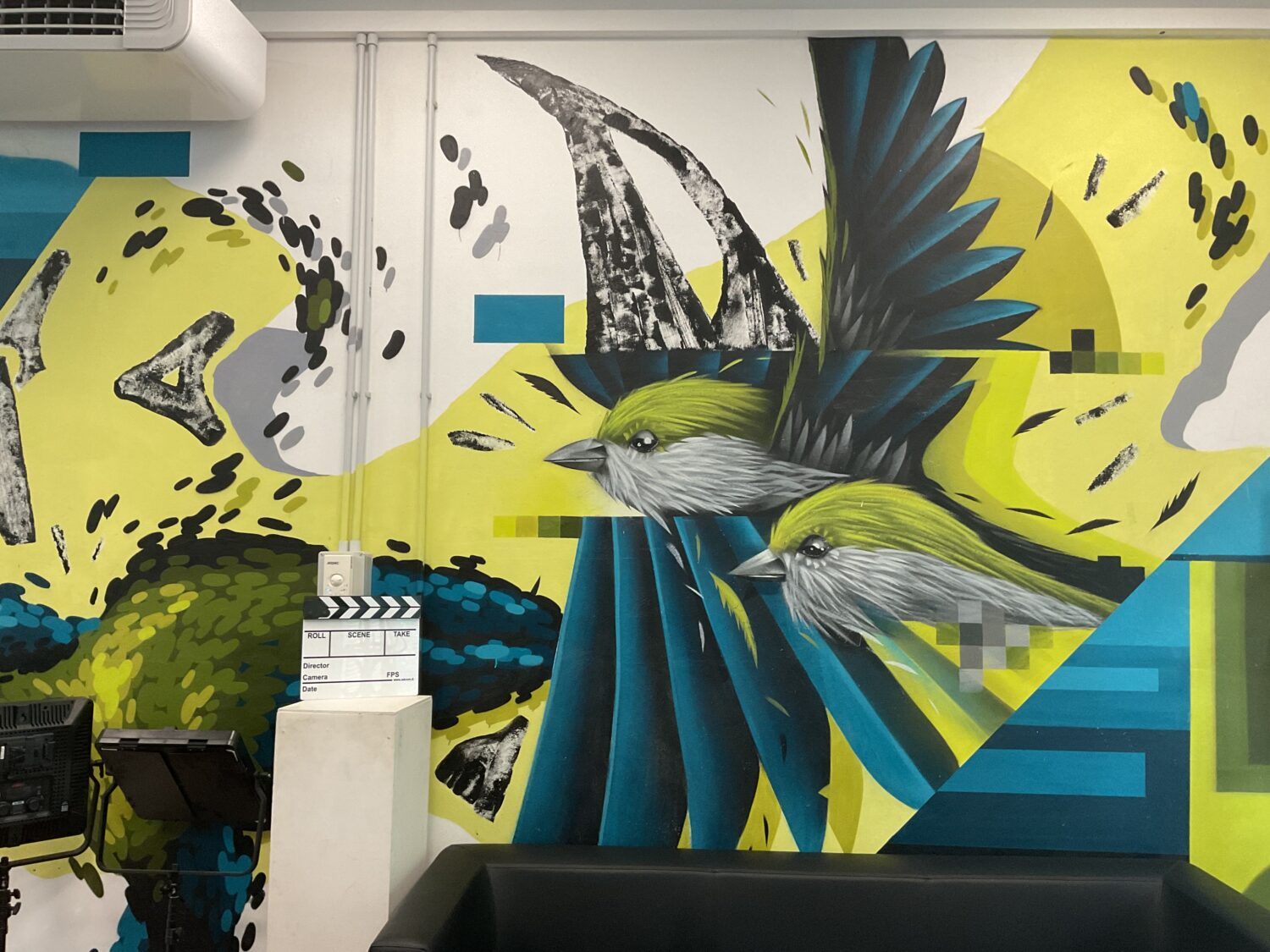 Per esempio, entrando nella stanza della nuova sede, non potevo non notare il bellissimo graffito di Psiko che in diverse tonalità e sfumature di giallo e blu ritrae degli uccelli in volo. Fa parte di un progetto, GraffiaFe, iniziato nel 2006 e terminato nel 2015, tenuto proprio dagli stessi writer che anni prima avevano partecipato ad un laboratorio, in maniera del tutto volontaria.