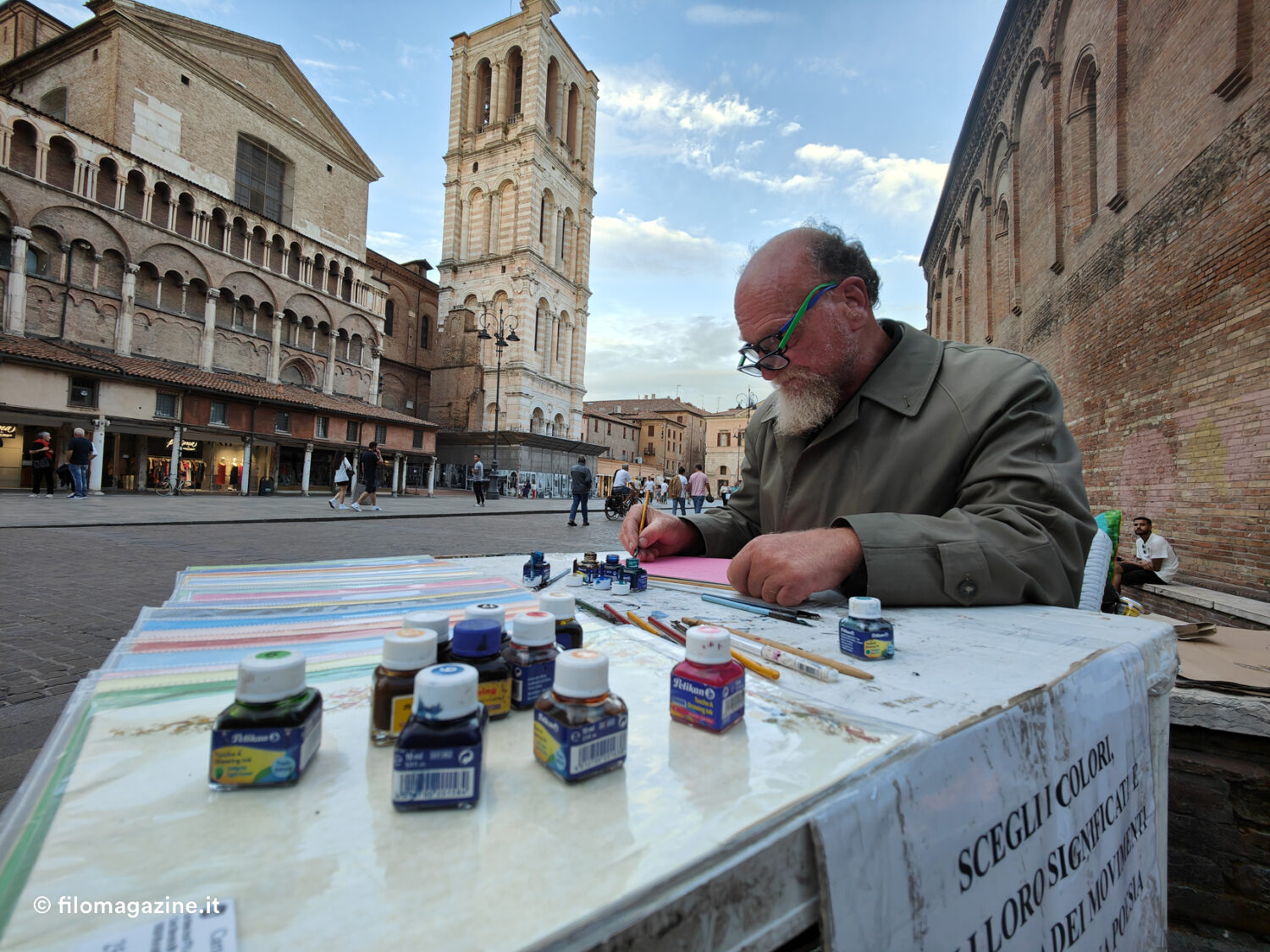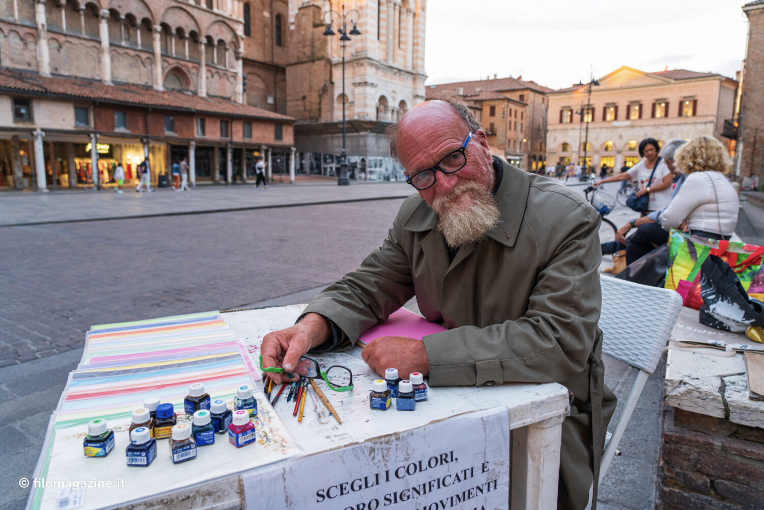 Pier Francesco Betteloni non è originario di Ferrara, è nato a Bonn in Germania, ma in questa città un po’ piccola e un po’ caratteristica ci si trova molto bene, o almeno così dice. L’affetto è reciproco: durante le prime timide riaperture post-Covid gli venne esplicitamente chiesto di tornare a comporre poesie – dopo ben due mesi di silenzio da parte sua. Perché rivedere comparire al suo solito posto una figura così nota, protagonista della scena cittadina ferrarese, avrebbe certamente trasmesso un senso di tranquillità e di fiducia ai ferraresi. E così è stato.