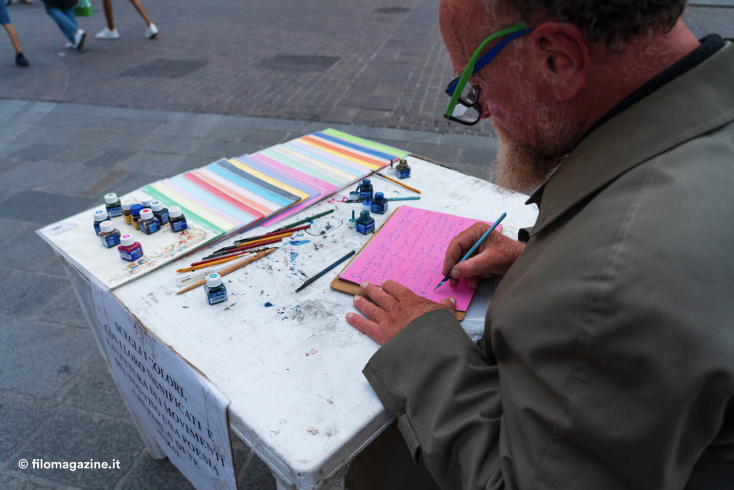 È facile diventare spettatori di mille avventure e scoprire tanti aneddoti interessanti e curiosi quando si parla con lui. Ad esempio che è il quarto di una lunga generazione di poeti, che ha viaggiato per tanti posti diversi, arricchendosi in ogni terra visitata di nuove conoscenze, che la cultura è il suo vero pane quotidiano. Per molto tempo vari artisti avevano l’abitudine di darsi appuntamento davanti al suo tavolo all’inizio di San Romano, vicino a Piazza Trento e Trieste: un vero e proprio “Angolo degli Artisti”.