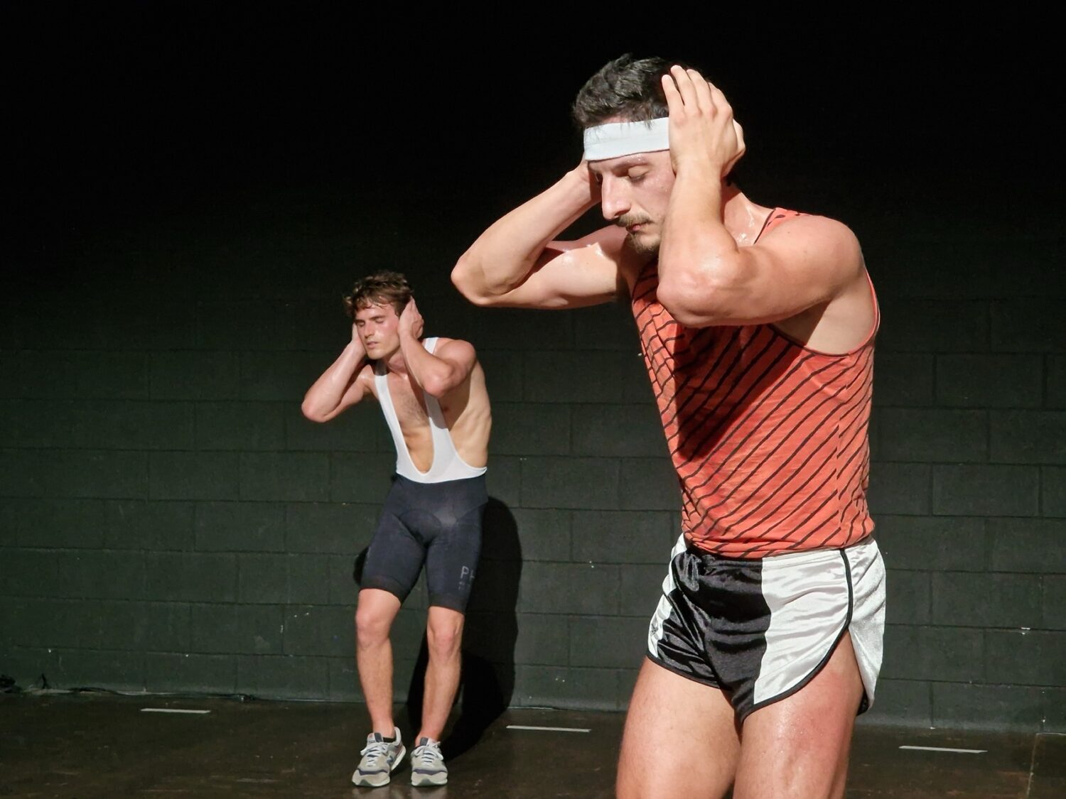 La mia percezione è che il cambio di posizione in sala di Francesca non sia un vero ritirarsi dalla scena. Forse piuttosto che, così facendo, abbia tracciato un nuovo spazio scenico nel quale, ben oltre alla prospettiva dello spettatore, l’intera sala nera del Teatro sia stata improvvisamente coinvolta in un processo. Una performance articolata in cinque capitoli, ma preceduti da una fase pre e da una post: è qui che il fantasma del rito aleggia e volutamente stride con i costumi contemporanei iper-sportivi dei performers. Ogni capitolo smonta il senso comune del tempo in un modo diverso, tutti insieme portano in scena l’intenso allenamento con cui i performers/atleti si preparano fisicamente e mentalmente, fino a mettersi alla prova, prima in imprese individuali ed infine nella serratissima gara a squadre nelle quali non mancano tocchi comici e off.