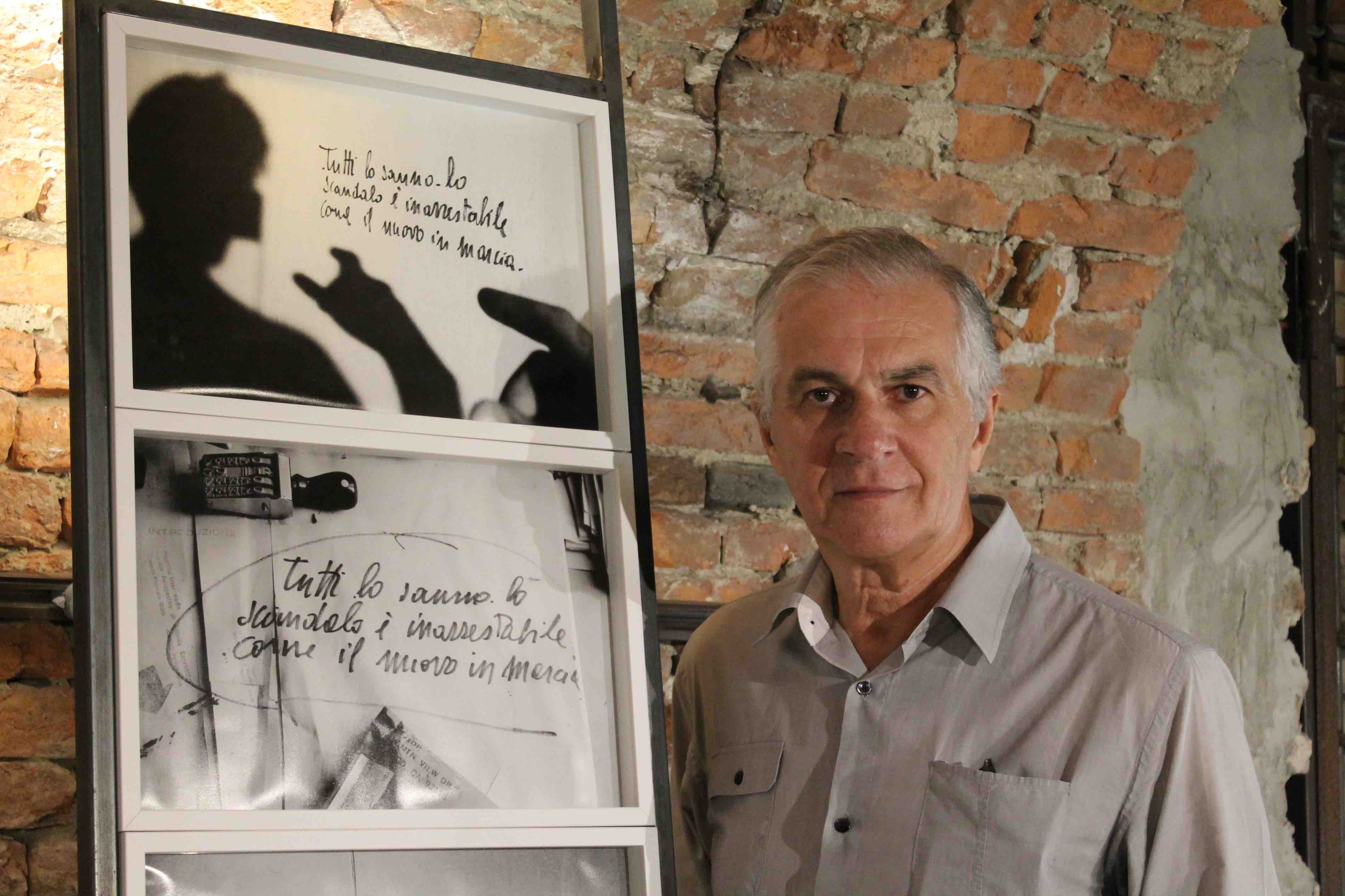 L’opera in mostra da zanzara arte contemporanea è del 1975 ed è il risultato di un’azione urbana registrata con il Geloso (“allora c’era il Geloso, un registratore a bobina, lo chiamavamo il Gelosino”) e documentata fotograficamente. L’opera è una commistione tra fotografia e suono e secondo l’artista è proprio il suono, la sua potenza che agisce sull’immagine, “è come se attivasse l’immagine fissa”.