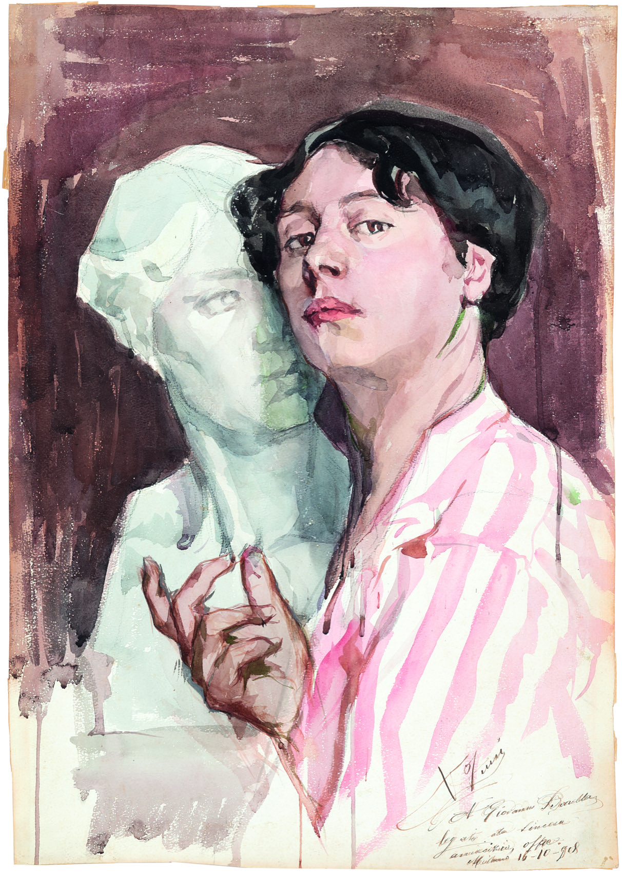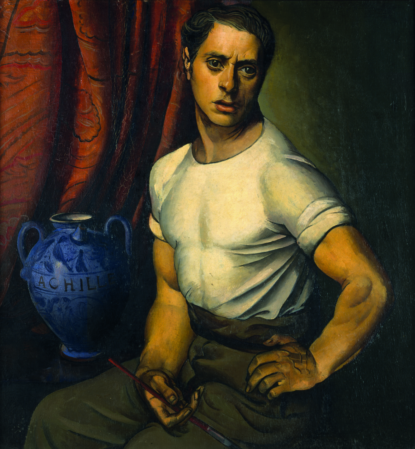 In quanto artista, si forma dai 12 ai 15 anni all’Istituto d’arte Dosso Dossi di Ferrara per poi proseguire all’Accademia a Brera a partire dal 1906, quando tutta la famiglia si trasferisce a Milano. Appartengono proprio a tale sguardo giovane e alle prime prove accademiche, alcuni suoi ritratti della prima sala che accoglie il visitatore. Come Autoritratto (1907) in cui si raffigura a fianco a un mezzo busto, scultura che potrebbe essere considerata il suo alter ego, quello storico: e come se volesse enfatizzare la sua passione per il classico e parallelamente modernizzarlo.