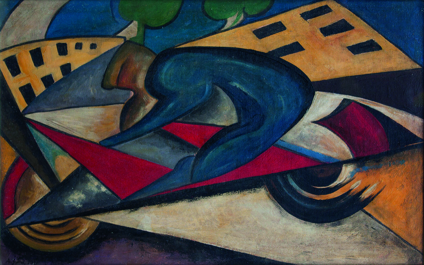 “Il pittore è un moderno erede di una modellistica classica, che gli consentiva di rimontare a suo giudizio i pezzi dell’iconografia tradizionale. L’accostamento era per frammenti, e secondo una costruzione neoprimitiva della superficie.” Sarà proprio la sua esigenza primaria di un “ritmo plastico puro” che gradualmente lo allontanerà dal movimento futurista. Un eccellente esempio della sua singolare visione futuristica ne è la serie che vede come protagonista la figura del motociclista.