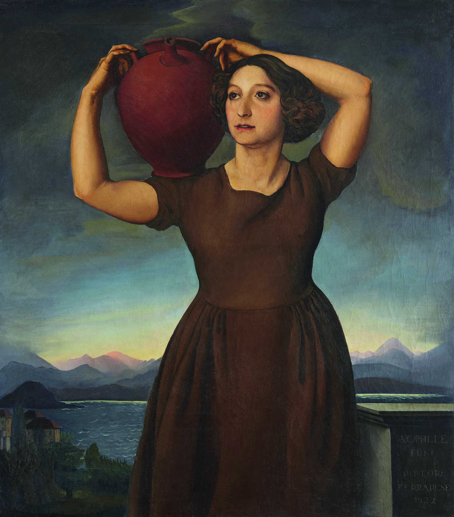 Come si accennava all’inizio, la mostra presenta anche alcuni ritrovamenti, come nel caso dell’opera L’acqua (1922), di cui si erano perse le tracce per un lungo lasso di tempo. Il dipinto rappresenta una donna che porta una brocca d’acqua mentre avanza sullo sfondo di un paesaggio. Tale figura si inserisce perfettamente nell’immaginario femminile di Funi, ossia delle fanciulle dolci e moderne.