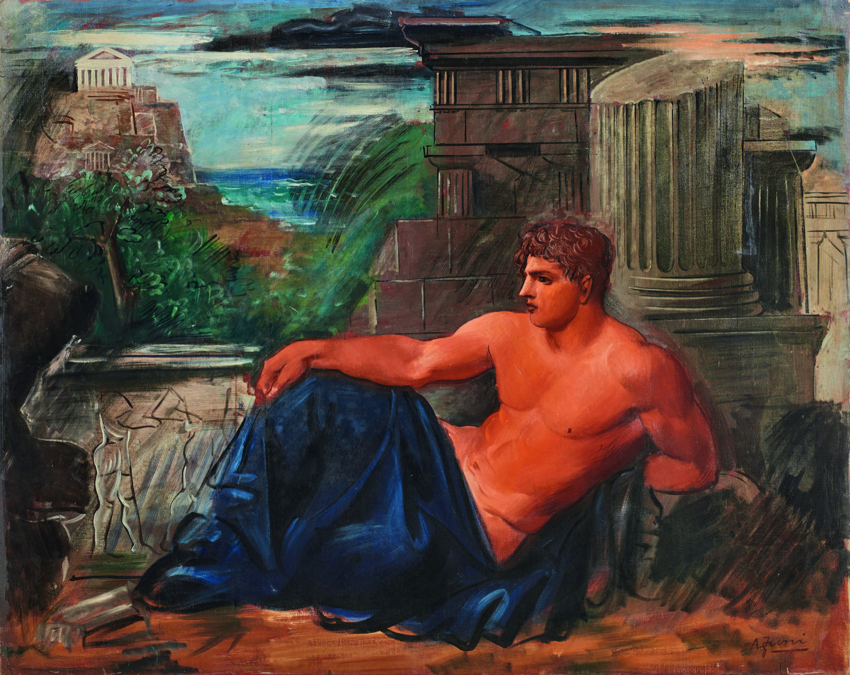 Achille Funi fu uno dei fondatori del “Novecento” prima un raggruppamento e poi un vero e proprio movimento, che si articolava in varie tendenze di ritorno al passato, coordinato dalla critica d’arte Margherita Sarfatti, che nasce ufficialmente nel 1923. Il ferrarese fu tra i più fedeli all’ideale classico proiettato alla contemporaneità. Recupera i colori e il tema del paesaggio, incentivato da alcuni soggiorni a Roma o Trieste, come Il Faro romano (1930). Inoltre, arricchisce il suo repertorio pittorico includendo simboli e miti antichi, soggetti ispirati all’antica Grecia o alla romanità, come Riposo di Apollo (primi anni ‘30).