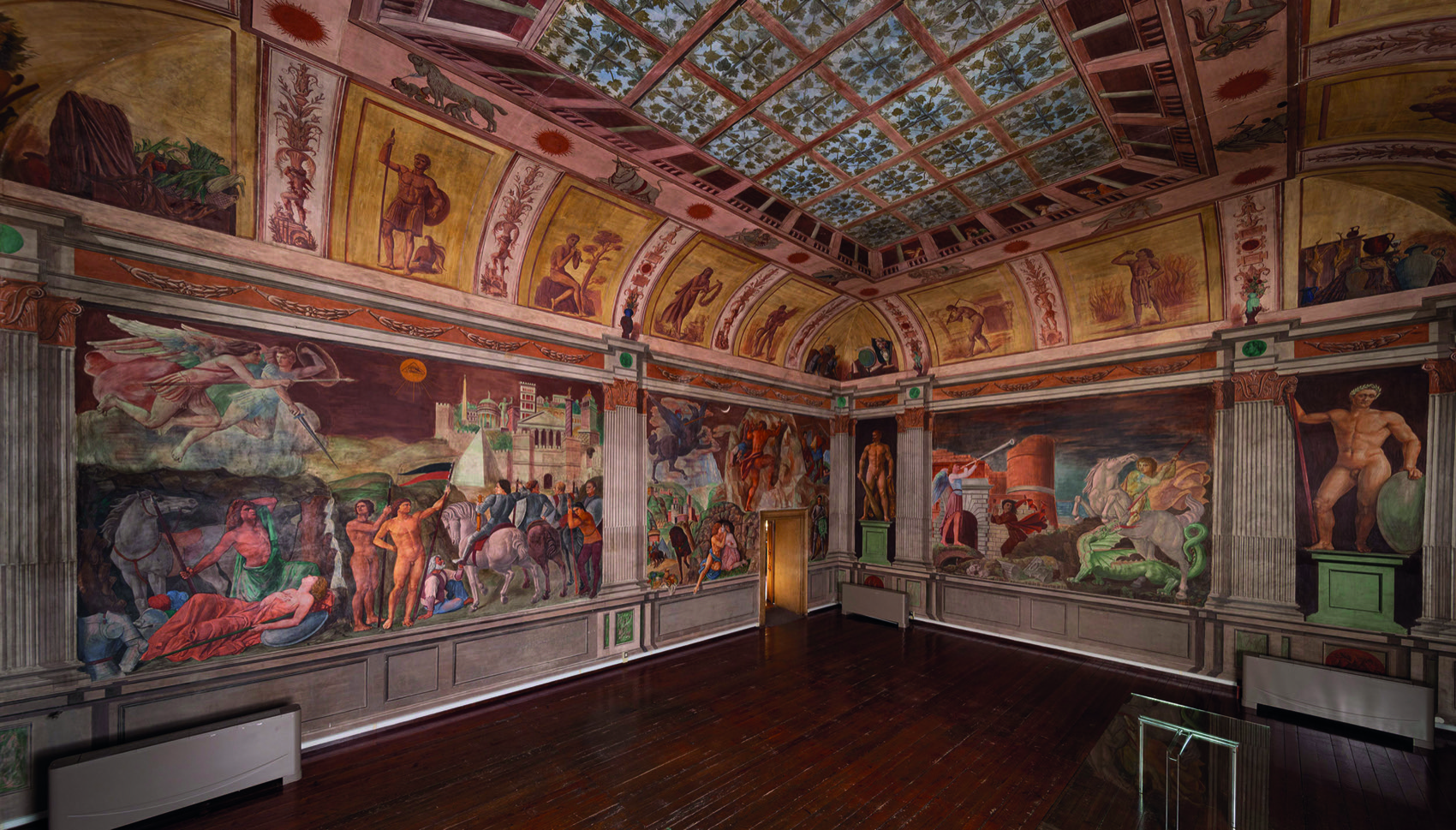 Possono essere individuate attorno al 1930/1932 le sue prime realizzazioni di pittura murale. Era un grande sostenitore di tale tecnica ed effettivamente si può senza ombra di dubbio affermare che fu per merito suo e di Mario Sironi che quest’arte ritrovò una nuova fortuna. Quando decise di dedicarsi all’affresco, non si improvvisò pittore murale, ma si recò a fare esperienze in alcune botteghe bergamasche. Uno dei suoi magnifici lavori parietali si trova proprio a Ferrara, nella Sala dell’Arengo nel Palazzo Municipale. Uno straordinario affresco che si sviluppa su quattro pareti Mito di Ferrara, ciclo realizzato tra il 1934 e il 1937, è distribuito su tutto lo spazio, senza aperture. L’opera rifiuta il principio della distanza e della prospettiva e i temi scelti – Gli Arcangeli e la Morte o Tancredi e Clorinda – sono all’insegna del meraviglioso, del registro alto, del tono epico. L’intento è di evocare il mito come punto d’incontro tra presente e passato.