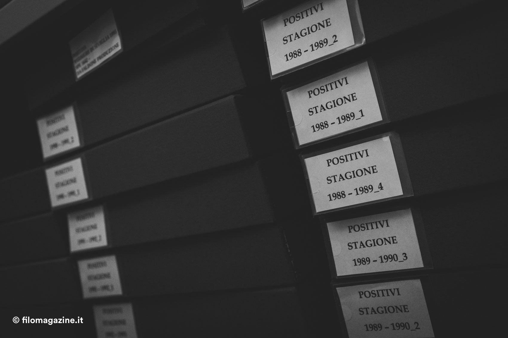 Ecco, ci siamo: la tazzina di caffè si è svuotata mentre la matita fermava veloce su carta la curiosità, così balziamo in piedi dalla sedia e seguiamo le nostre guide. Lo stanzino attiguo è letteralmente foderato di armadi, qualcuno più polveroso di altri, e subito ci chiediamo come sia possibile tenere “sempre in ordine” un patrimonio documentale così esteso. L’estrema varietà dei materiali, spiegano, ha richiesto uno specifico trattamento non solo nel tipo di conservazione, ma in primo luogo nel sistematico processo di suddivisione.