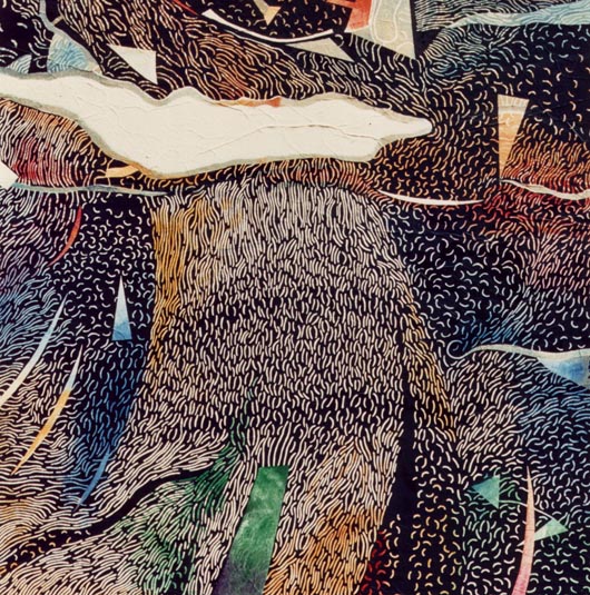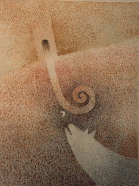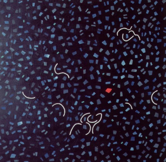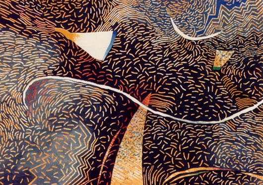 Una necessità quella di cogliere il bello nelle piccole cose, che ricorre negli anni successivi dominati da tinte delicate e soggetti onirici e fantastici, che attingono a piene mani dall’immaginario infantile. È una parentesi breve che la porta sul finire degli anni Ottanta all’informale: le forme si spogliano del superfluo, diventando essenziali, astratte, in un viaggio alla ricerca di un linguaggio visivo fatto di semplicità e purezza. Linee nette e decise si intrecciano con curve morbide e giocose, mentre triangoli e piccoli “bisciolini” sembrano danzare liberi, come microorganismi al microscopio che scappano in ogni direzione mossi da una forza invisibile. Questa energia si manifesta in segni bizzarri, vortici dinamici che ricordano i ricci ribelli che da sempre prova a domare sulla testa, specchio di una personalità vivace e indomita.
