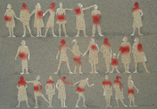 Però è mio dovere, come amico di lunga data e “nipotino” acquisito negli anni, raccontare a voi che leggete un po’ della sua poetica, per lasciarne traccia anche da queste parti, soprattutto alle nuove generazioni che magari non sono mai incappati in un suo quadro, in una sua mostra, o non hanno mai varcato la soglia del suo piccolissimo e prezioso studio di via Terranuova 30/a. Intanto vi lascio una sua opera qui (in realtà è un trittico): questa è la mia preferita, così vi fate un’idea. Credo che oggi appartenga alla collezione di Zeno Govoni dell’Hotel Annunziata e quando un domani sarò molto ricco forse andrò a chiedergli di comprarla.