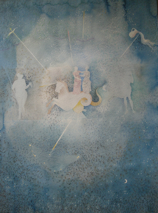 E in questa sotto, assai simile nel tema ma più noir, iniziano a comparire i segni di una tecnica che negli anni a venire l’ha resa riconoscibile e iconica: i riempimenti spruzzati, a macchie, che vanno a impreziosire i suoi acquerelli con un tocco personalissimo e straordinario. Il colore soffiato da una piccola cannuccia di ferro è una texture a volte evidentissima e a volte in secondo piano, appena accennata. Un modo di caratterizzare luci e ombre, soggetti e sfondi che oggi in tanti applicano in digitale per dare un tocco sofisticato e vintage alle proprie opere, ma che in pittura sono tutt’altro che scontati.