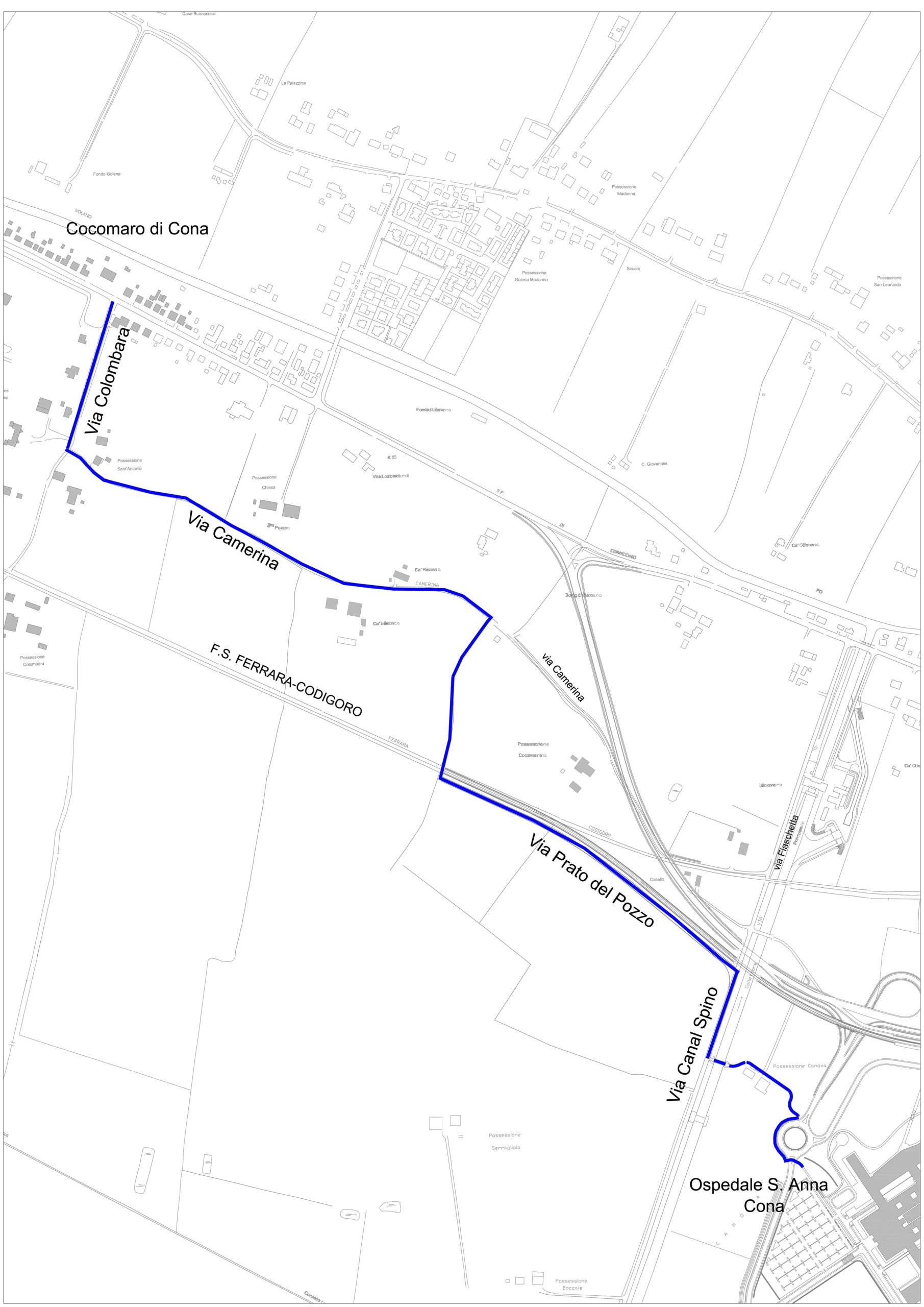 Il percorso ciclabile avrà origine dalla via Fiaschetta, in corrispondenza del polo ospedaliero di Cona, proseguirà quindi parallelamente alla ‘superstrada’ (RA8) Ferrara-Porto Garibaldi sulla via Boccale fino all’intersezione con la via Ricciarelli, attraversando poi il centro abitato di Aguscello sino all’intersezione con via del Parco e si concluderà su quest’ultima in corrispondenza del tratto ciclabile esistente in corrispondenza della via Miles Davis. Da qui, percorrendo il sottopasso ciclopedonale, si potrà quindi raggiungere, tramite via San Bartolo oppure via Tambroni – via De Andrè, la via Comacchio all’altezza del quartiere Villa Fulvia.