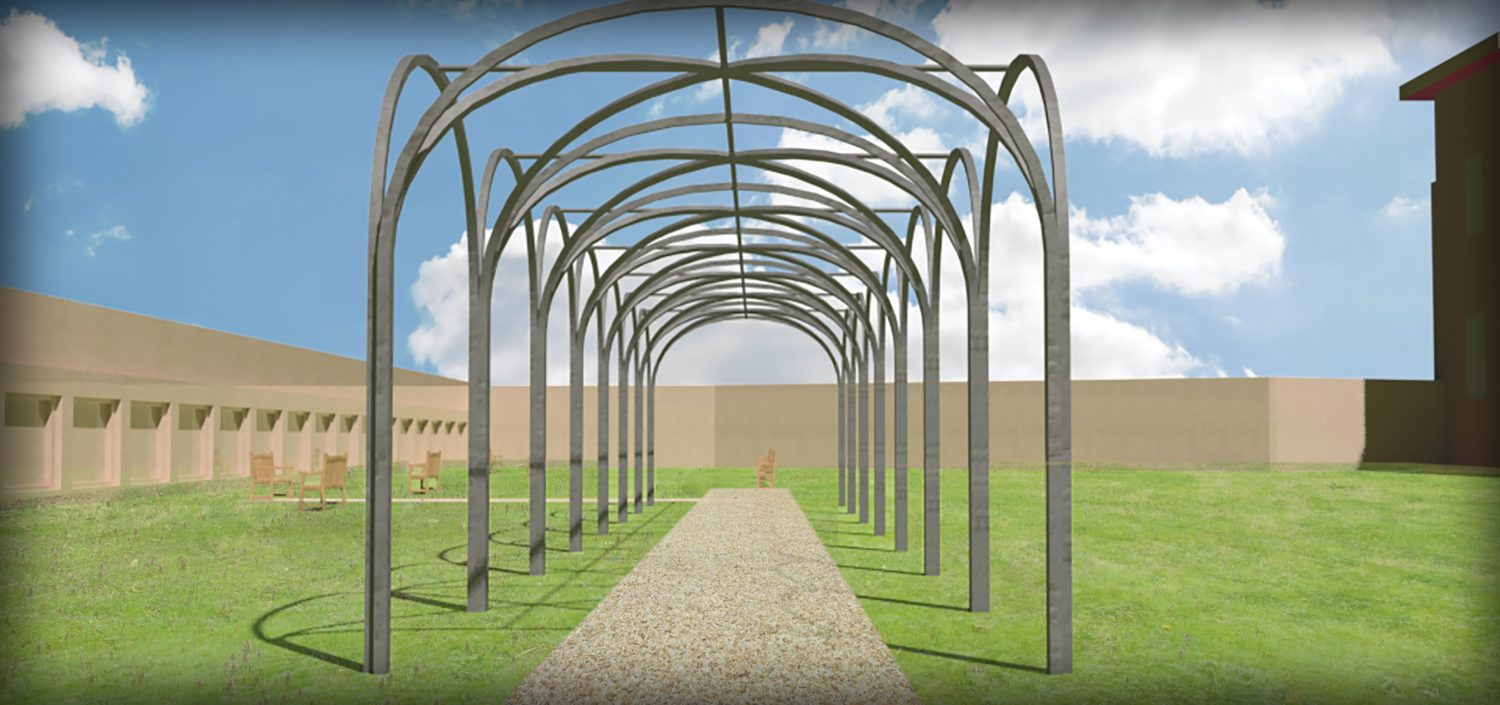 Le pergole di metallo, sulle quali crescono rose rampicanti, si compongono di due ali poste simmetricamente rispetto all’entrata d’onore al giardino: il braccio a destra che introduce ad uno spazio raccolto, una passeggiata cadenzata da alberi di frutti antichi allevati a spalliera e alberi delle stesse specie accostati a siepi, che accompagnano il fronte del palazzo disegnando per esso una quinta su cui affacciarsi e il braccio a sinistra che conduce all’edificio della ristorazione con un passaggio erboso lungo il quale alberi di frutti antichi sono anch’essi allevati a spalliera a ridosso di una sottile struttura di metallo pensata a mascheramento dell’edificio di servizio accanto.