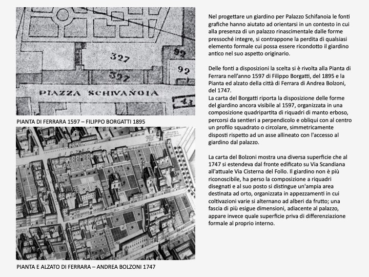 Il progetto di Riqualificazione dello storico Giardino di Palazzo Schifanoia è stato presentato alla stampa giovedì 1 luglio 2021 nella sede della residenza municipale. L’Inizio dei lavori è previsto per ottobre 2021. Le forme introdotte si propongono di comporre un margine lungo il confine nord del giardino, il tratto più sensibile e disperso, contraltare del palazzo e marcata interruzione dell’assetto originario, disposto lungo la linea dalla quale, nel 1597, avevano inizio i riquadri erbosi, arricchendolo di episodi quali due pergole, siepi, alberi di frutti antichi allevati a spalliera e alberi di frutti antichi, disposti in filari associati a siepi, che permettono una composizione rivolta a specie vegetali e pratiche di coltivazione attinte dalla tradizione rinascimentale del fare i giardini.