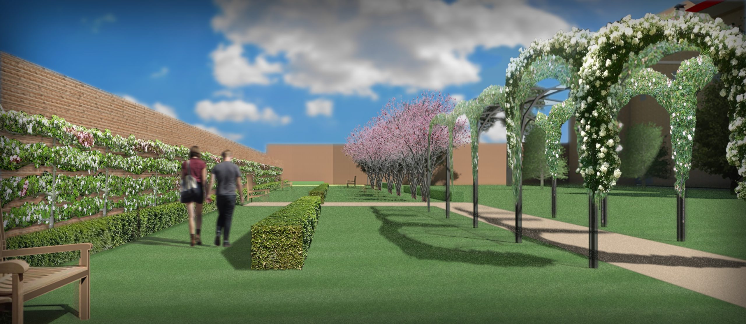 Le pergole di metallo, sulle quali crescono rose rampicanti, si compongono di due ali poste simmetricamente rispetto all’entrata d’onore al giardino: il braccio a destra che introduce ad uno spazio raccolto, una passeggiata cadenzata da alberi di frutti antichi allevati a spalliera e alberi delle stesse specie accostati a siepi, che accompagnano il fronte del palazzo disegnando per esso una quinta su cui affacciarsi e il braccio a sinistra che conduce all’edificio della ristorazione con un passaggio erboso lungo il quale alberi di frutti antichi sono anch’essi allevati a spalliera a ridosso di una sottile struttura di metallo pensata a mascheramento dell’edificio di servizio accanto.
