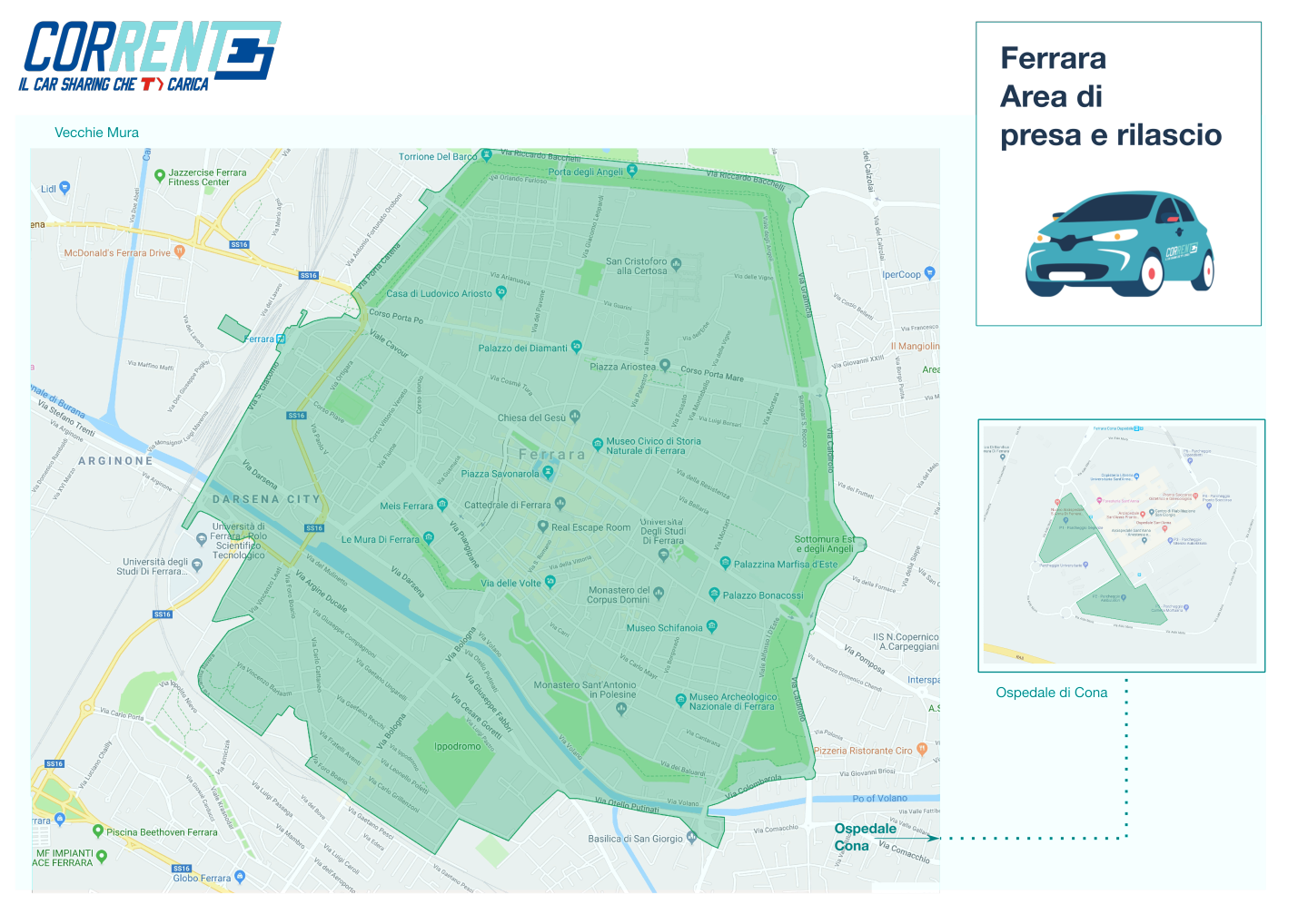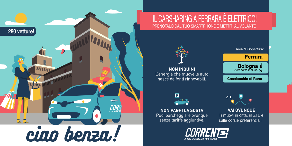 CORRENTE sarà ufficialmente operativa a Ferrara da sabato 25 maggio, dopo il bike sharing anche il car sharing elettrico arriva nella nostra città! Il servizio è quello tipico di un car sharing a flusso libero. Le prime auto saranno posizionate tra venerdì 24 e sabato 25 all’interno dell’area di copertura cittadina e dalla mezzanotte sarà possibile noleggiarle ed usarle in libertà. Per farlo è sufficiente aver scaricato la app ed essersi registrati indicando i propri dati ed allegando patente di guida e carta di identità. La registrazione richiede solo qualche minuto e si paga naturalmente con carta di credito, anche prepagata, soltanto il tempo di effettivo uso. CORRENTE è utilizzabile anche dai neopatentati.